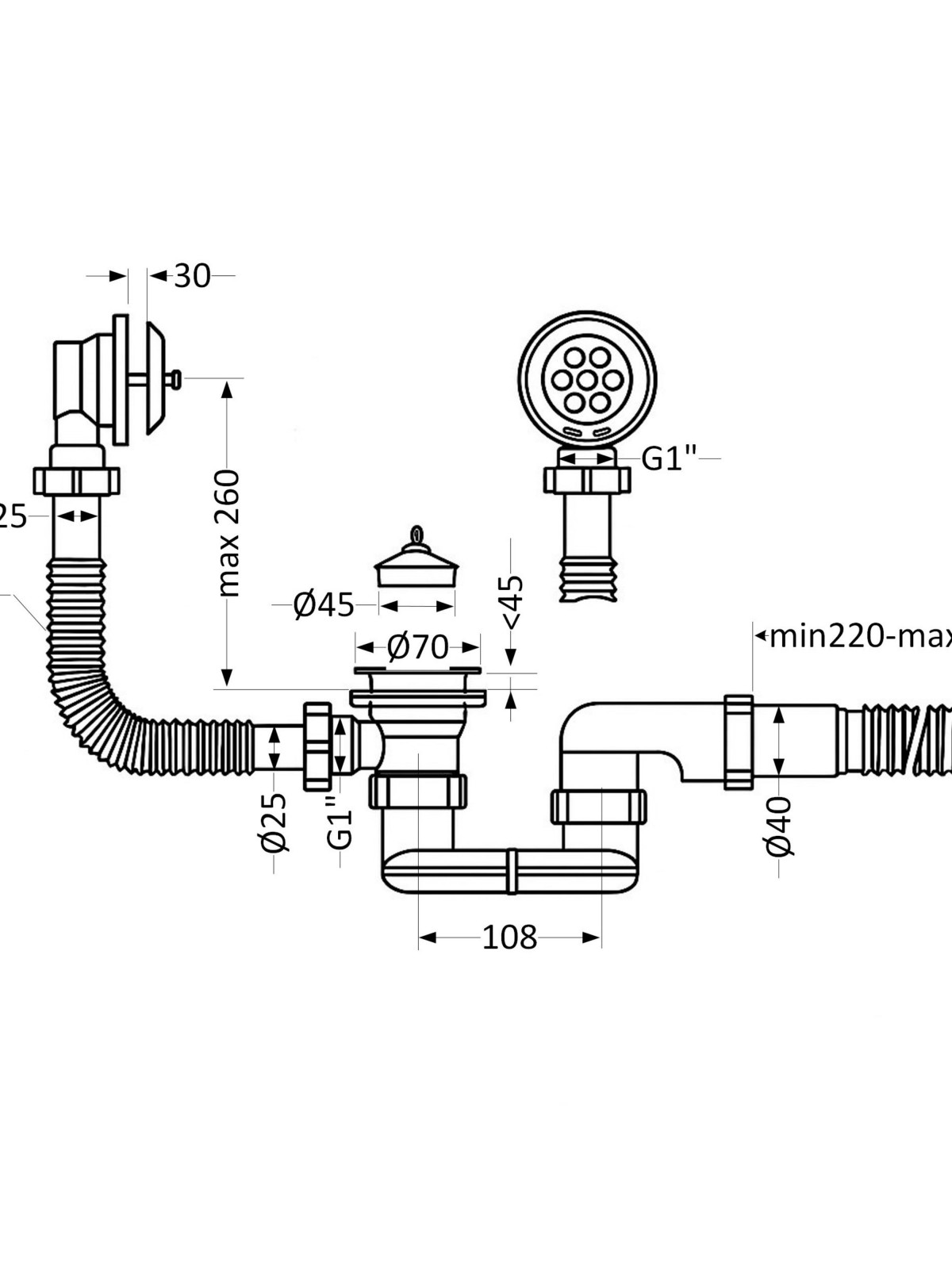Комплектація: Сифон, випуск, перелив, гофрована труба, перехідна труба.