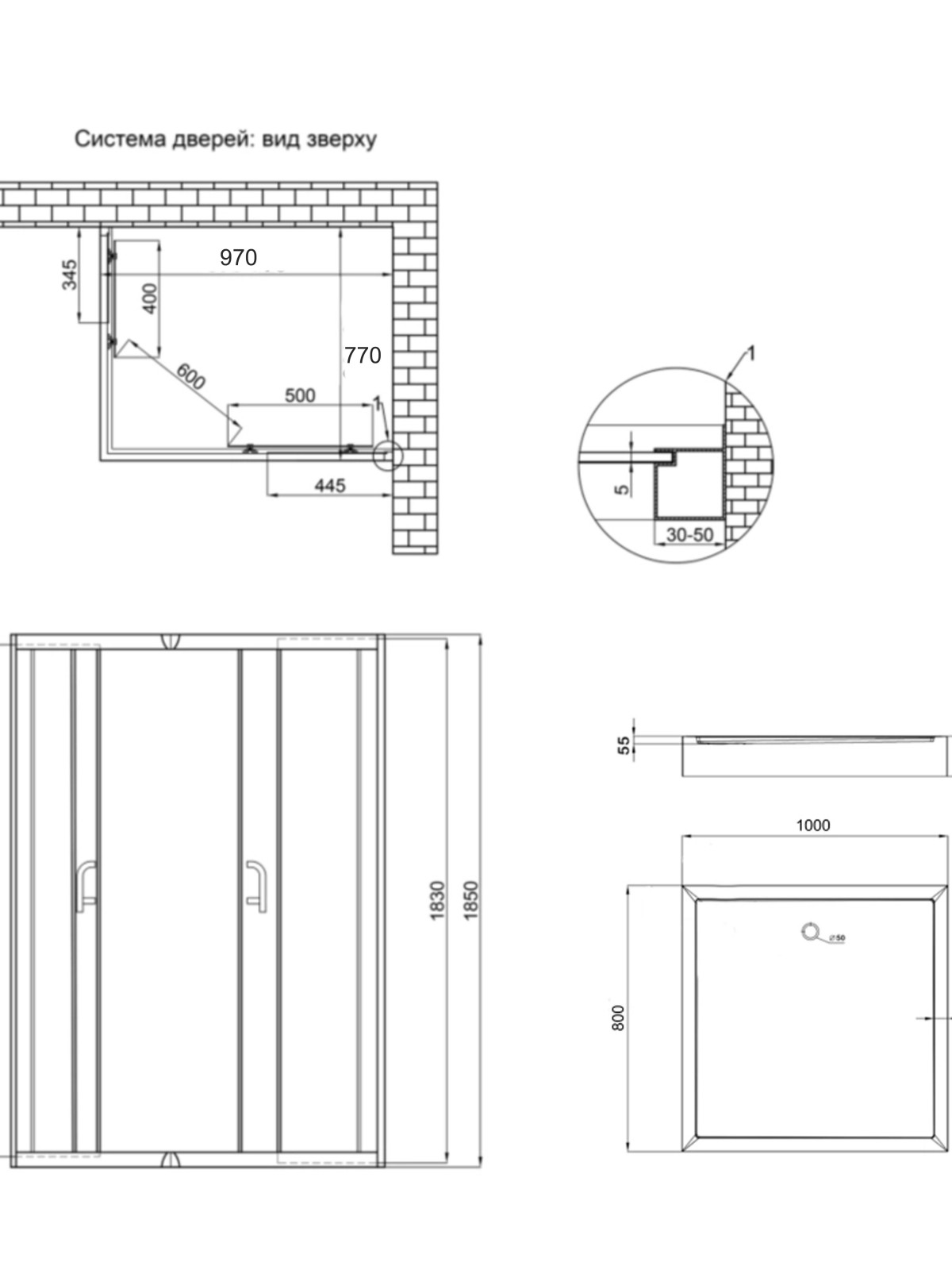 Комплектація: Профіль, подвійні ролики, ручки, комплект кріпильних деталей, глухе скло, скляні двері, піддон, сифон, ніжки.