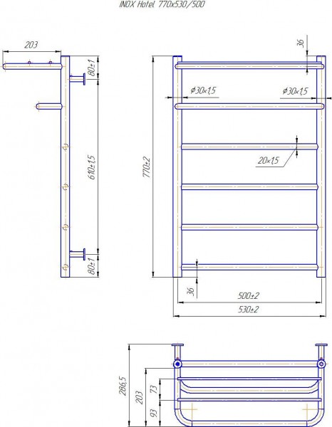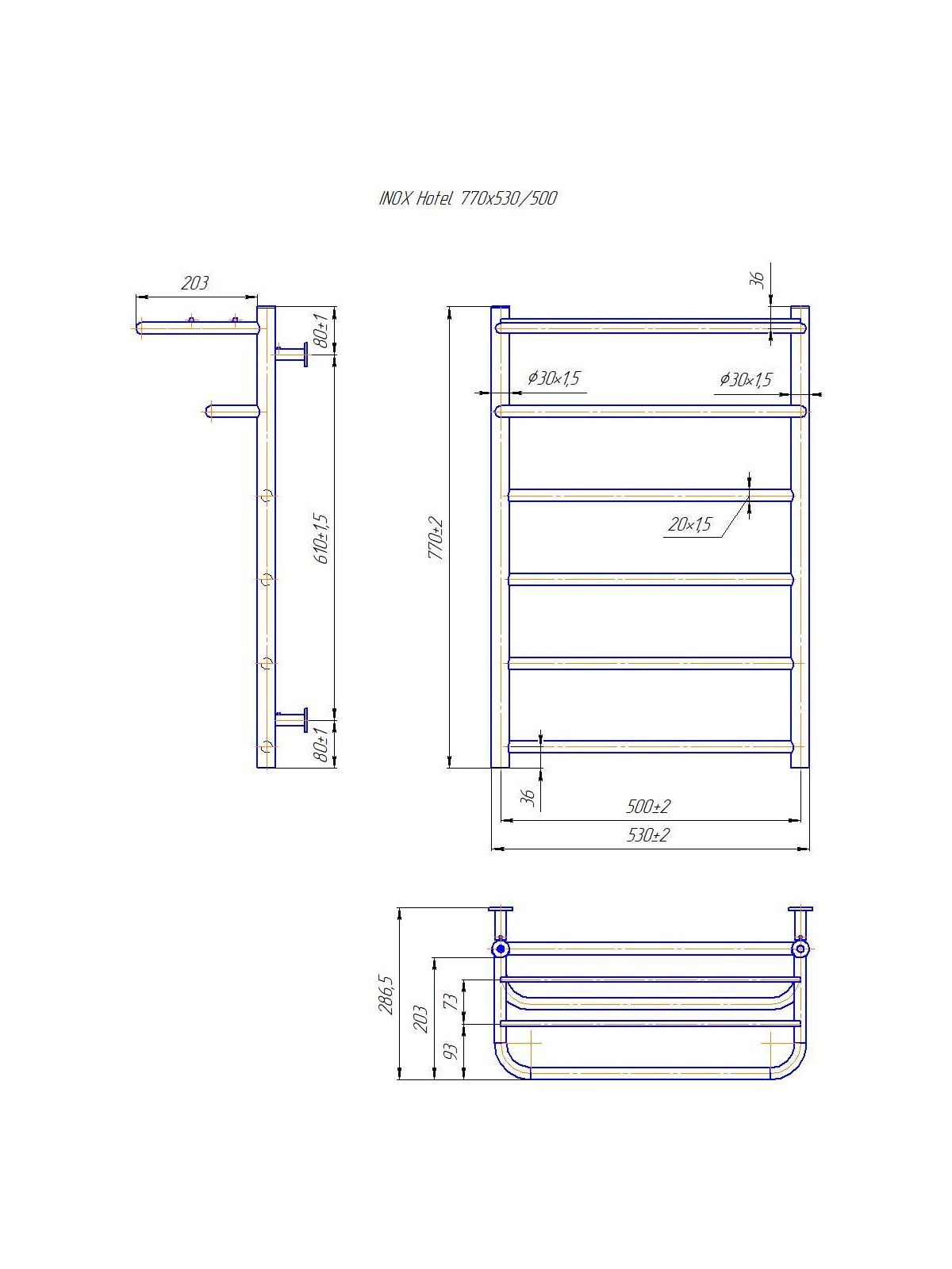 Рушникосушарка INOX Готель 770х530/500. Розміри: висота - 770 мм, ширина - 530 мм, глибина 260 мм, міжцентрова відстань для підключення - 500 мм, діаметр підключення G1/2''. Варіанти підключення: нижнє, діагональне та бічне. Кількість ребер - 6. Виготовлена з полірованої нержавіючої сталі без хромування. Для всесезонної роботи водяну модель можна переобладнати на комбіновану, встановивши ТЕН, рекомендована потужність 300 Вт. Сумісні аксесуари: поворотні полиці та навісні гачки для збільшення функціональності. Рекомендовано підключати рушникосушарку за допомогою кранів Маріо. Гарантія - 50 років в закритій системі опалення, 5 років у централізованій.