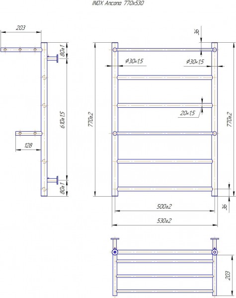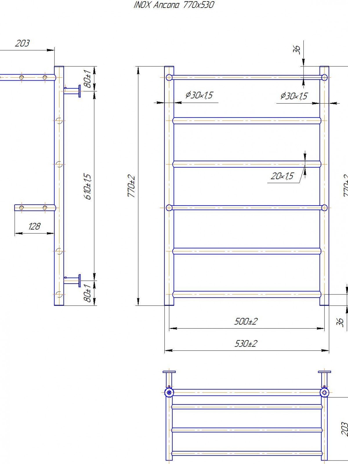 Рушникосушарка INOX Анкона 770х530/500. Розміри: висота - 770 мм, ширина - 530 мм, глибина 260 мм, міжцентрова відстань для підключення - 500 мм, діаметр підключення G1/2''. Варіанти підключення: нижнє, діагональне та бічне. Кількість ребер - 7. Виготовлена з полірованої нержавіючої сталі без хромування. Для всесезонної роботи водяну модель можна переобладнати на комбіновану, встановивши ТЕН, рекомендована потужність 300 Вт. Сумісні аксесуари: поворотні полиці та навісні гачки для збільшення функціональності. Рекомендовано підключати рушникосушарку за допомогою кранів Маріо. Гарантія - 50 років в закритій системі опалення, 5 років у централізованій.