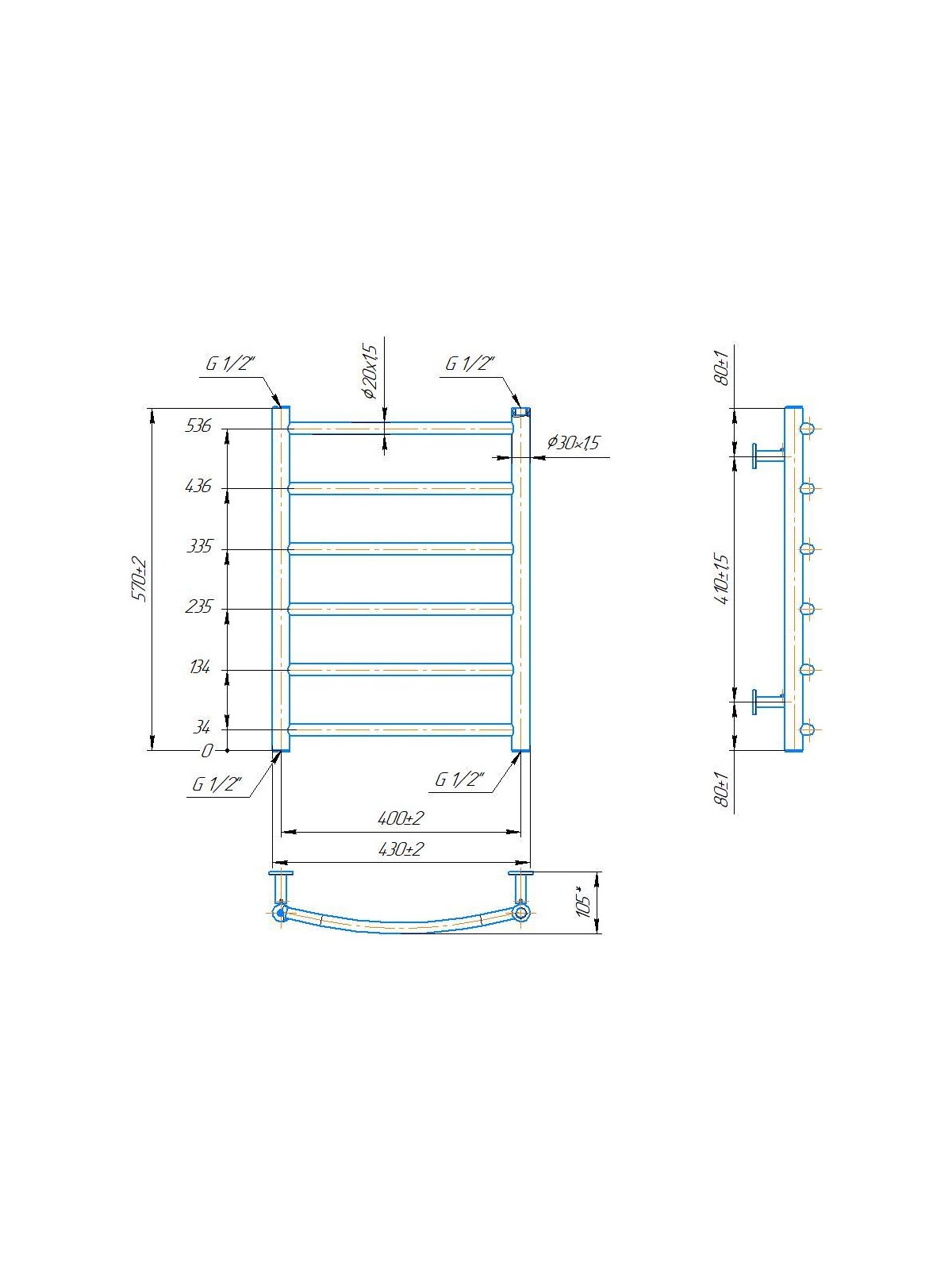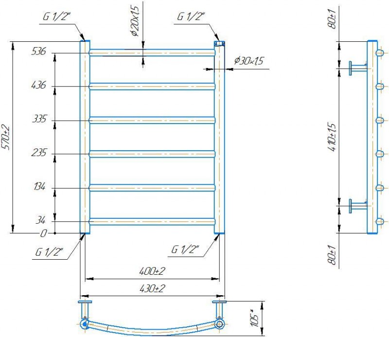 Рушникосушарка INOX Класік 570х430/400. Розміри: висота - 570 мм, ширина - 430 мм, глибина 85 мм, міжцентрова відстань для підключення - 400 мм, діаметр підключення G1/2''. Варіанти підключення: нижнє, діагональне та бічне. Кількість ребер - 6. Виготовлена з полірованої нержавіючої сталі без хромування. Для всесезонної роботи водяну модель можна переобладнати на комбіновану, встановивши ТЕН, рекомендована потужність 120 Вт. Сумісні аксесуари: поворотні полиці та навісні гачки для збільшення функціональності. Рекомендовано підключати рушникосушарку за допомогою кранів Маріо. Гарантія - 50 років в закритій системі опалення, 5 років у централізованій.