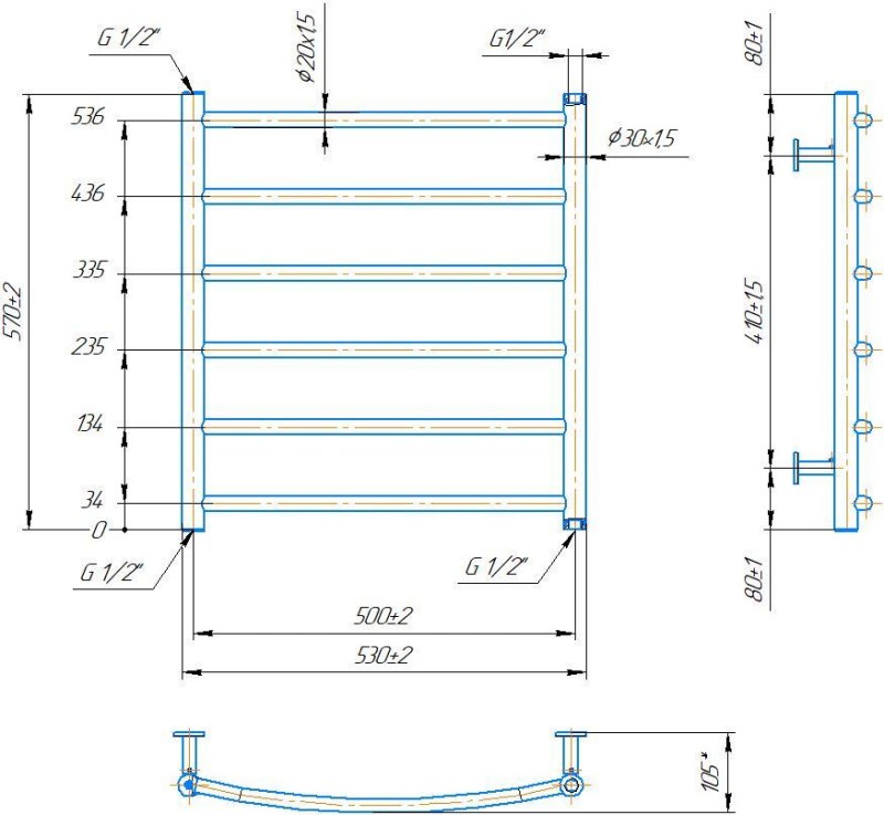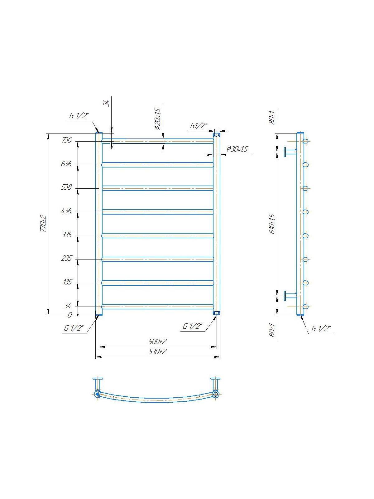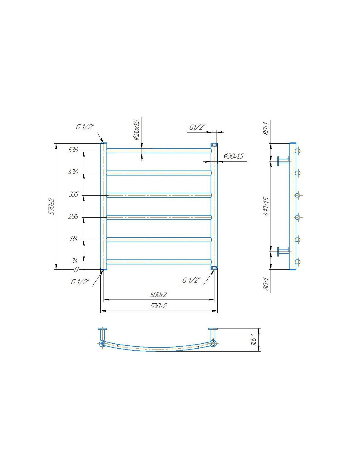 Рушникосушарка INOX Класік 570х530/500. Розміри: висота - 570 мм, ширина - 530 мм, глибина 90 мм, міжцентрова відстань для підключення - 500 мм, діаметр підключення G1/2''. Варіанти підключення: нижнє, діагональне та бічне. Кількість ребер - 6. Виготовлена з полірованої нержавіючої сталі без хромування. Для всесезонної роботи водяну модель можна переобладнати на комбіновану, встановивши ТЕН, рекомендована потужність 120 Вт. Сумісні аксесуари: поворотні полиці та навісні гачки для збільшення функціональності. Рекомендовано підключати рушникосушарку за допомогою кранів Маріо. Гарантія - 50 років в закритій системі опалення, 5 років у централізованій.