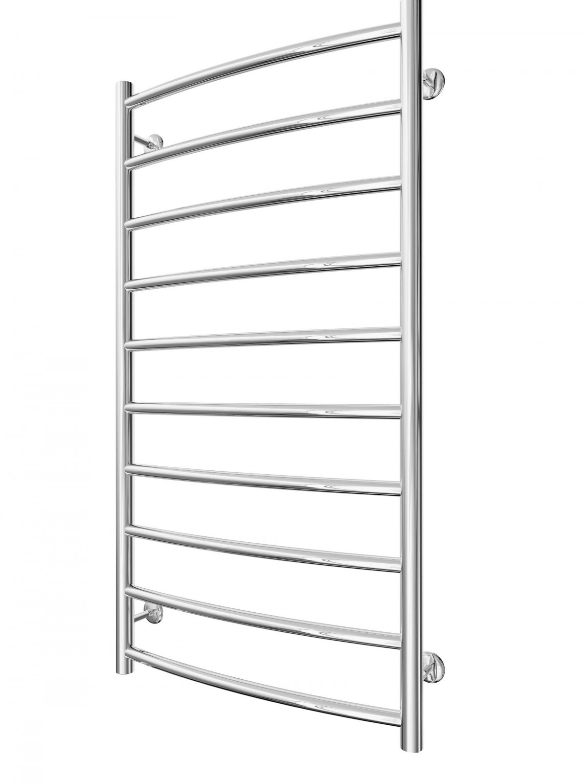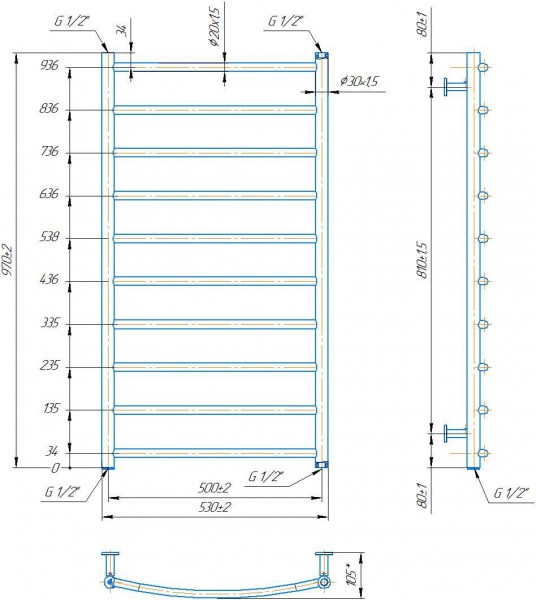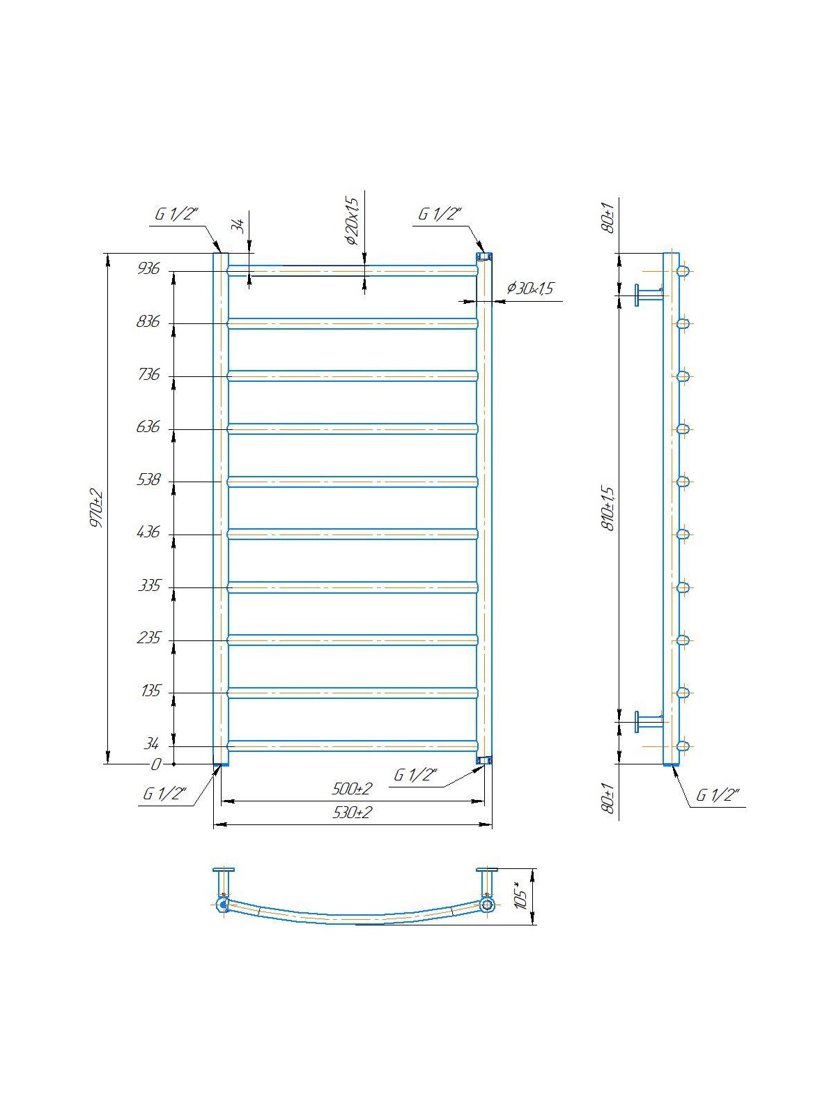 Рушникосушарка INOX Класік 970х530/500. Розміри: висота - 970 мм, ширина - 530 мм, глибина 90 мм, міжцентрова відстань для підключення - 500 мм, діаметр підключення G1/2''. Варіанти підключення: нижнє, діагональне та бічне. Кількість ребер - 10. Виготовлена з полірованої нержавіючої сталі без хромування. Для всесезонної роботи водяну модель можна переобладнати на комбіновану, встановивши ТЕН, рекомендована потужність 300 Вт. Сумісні аксесуари: поворотні полиці та навісні гачки для збільшення функціональності. Рекомендовано підключати рушникосушарку за допомогою кранів Маріо. Гарантія - 50 років в закритій системі опалення, 5 років у централізованій.
