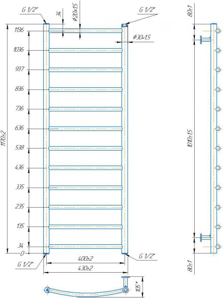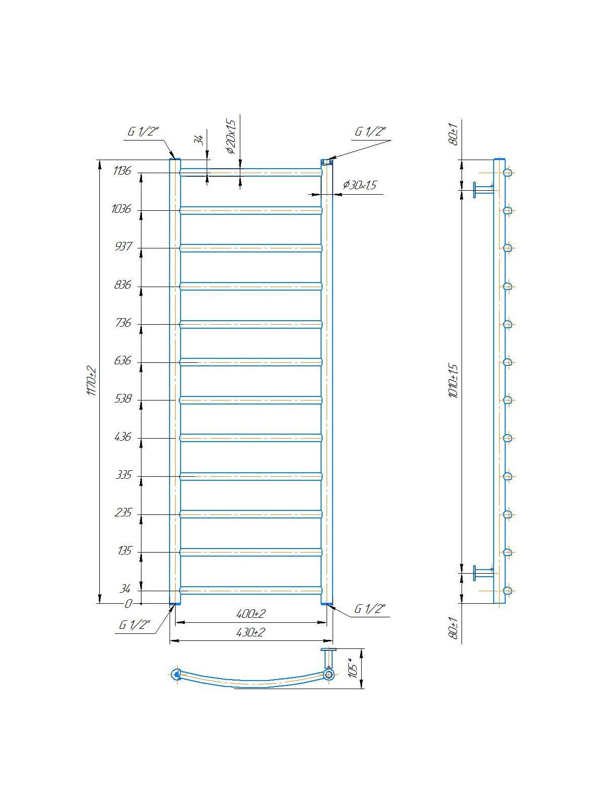 Рушникосушарка INOX Класік 1170х430/400. Розміри: висота - 1 170 мм, ширина - 430 мм, глибина 90 мм, міжцентрова відстань для підключення - 400 мм, діаметр підключення G1/2''. Варіанти підключення: нижнє, діагональне та бічне. Кількість ребер - 12. Виготовлена з полірованої нержавіючої сталі без хромування. Для всесезонної роботи водяну модель можна переобладнати на комбіновану, встановивши ТЕН, рекомендована потужність 300 Вт. Сумісні аксесуари: поворотні полиці та навісні гачки для збільшення функціональності. Рекомендовано підключати рушникосушарку за допомогою кранів Маріо. Гарантія - 50 років в закритій системі опалення, 5 років у централізованій.