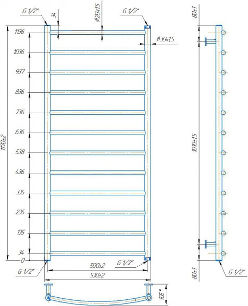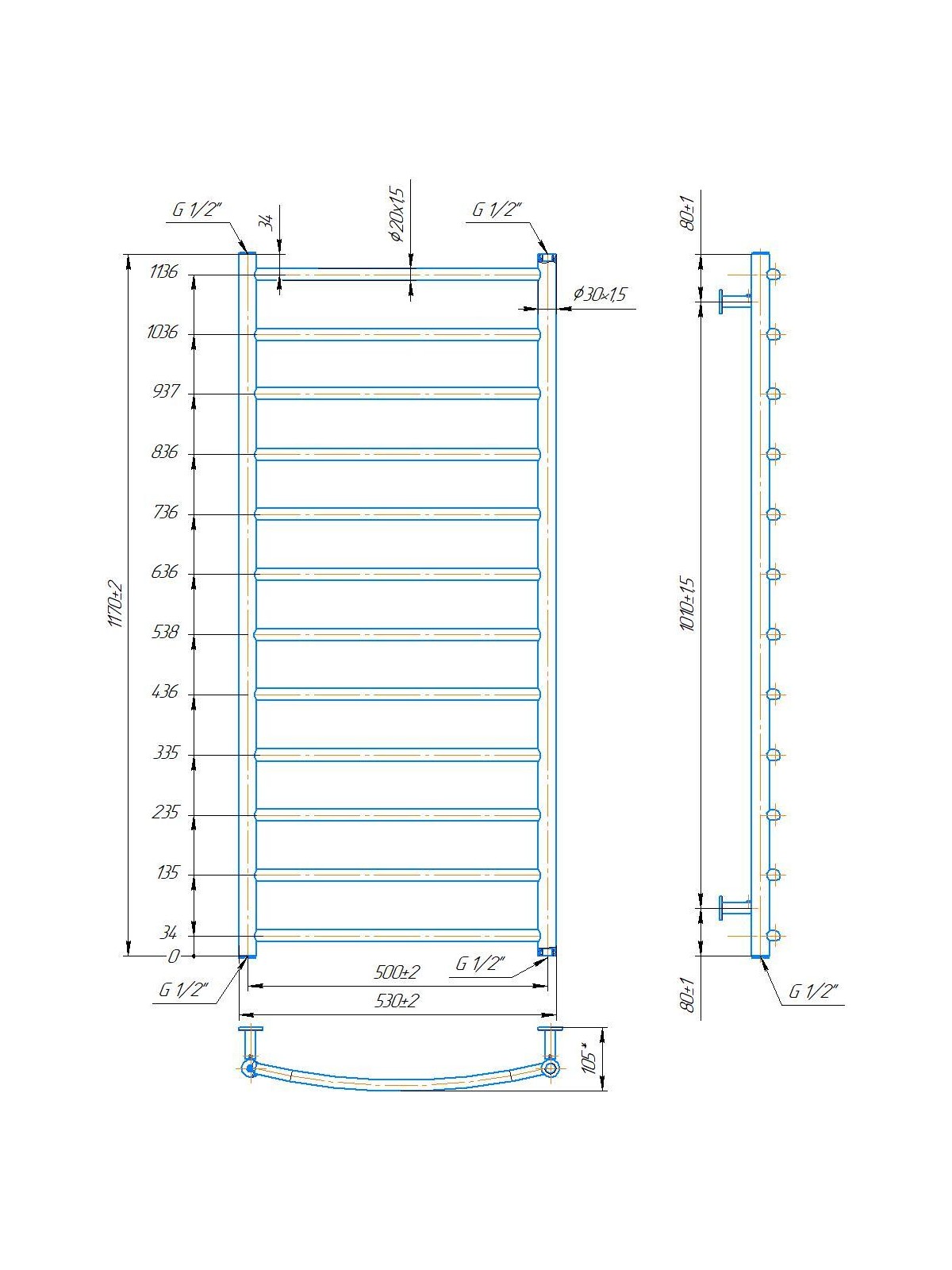 Рушникосушарка INOX Класік 1170х530/500. Розміри: висота - 1 170 мм, ширина - 530 мм, глибина 90 мм, міжцентрова відстань для підключення - 500 мм, діаметр підключення G1/2''. Варіанти підключення: нижнє, діагональне та бічне. Кількість ребер - 12. Виготовлена з полірованої нержавіючої сталі без хромування. Для всесезонної роботи водяну модель можна переобладнати на комбіновану, встановивши ТЕН, рекомендована потужність 300 Вт. Сумісні аксесуари: поворотні полиці та навісні гачки для збільшення функціональності. Рекомендовано підключати рушникосушарку за допомогою кранів Маріо. Гарантія - 50 років в закритій системі опалення, 5 років у централізованій.