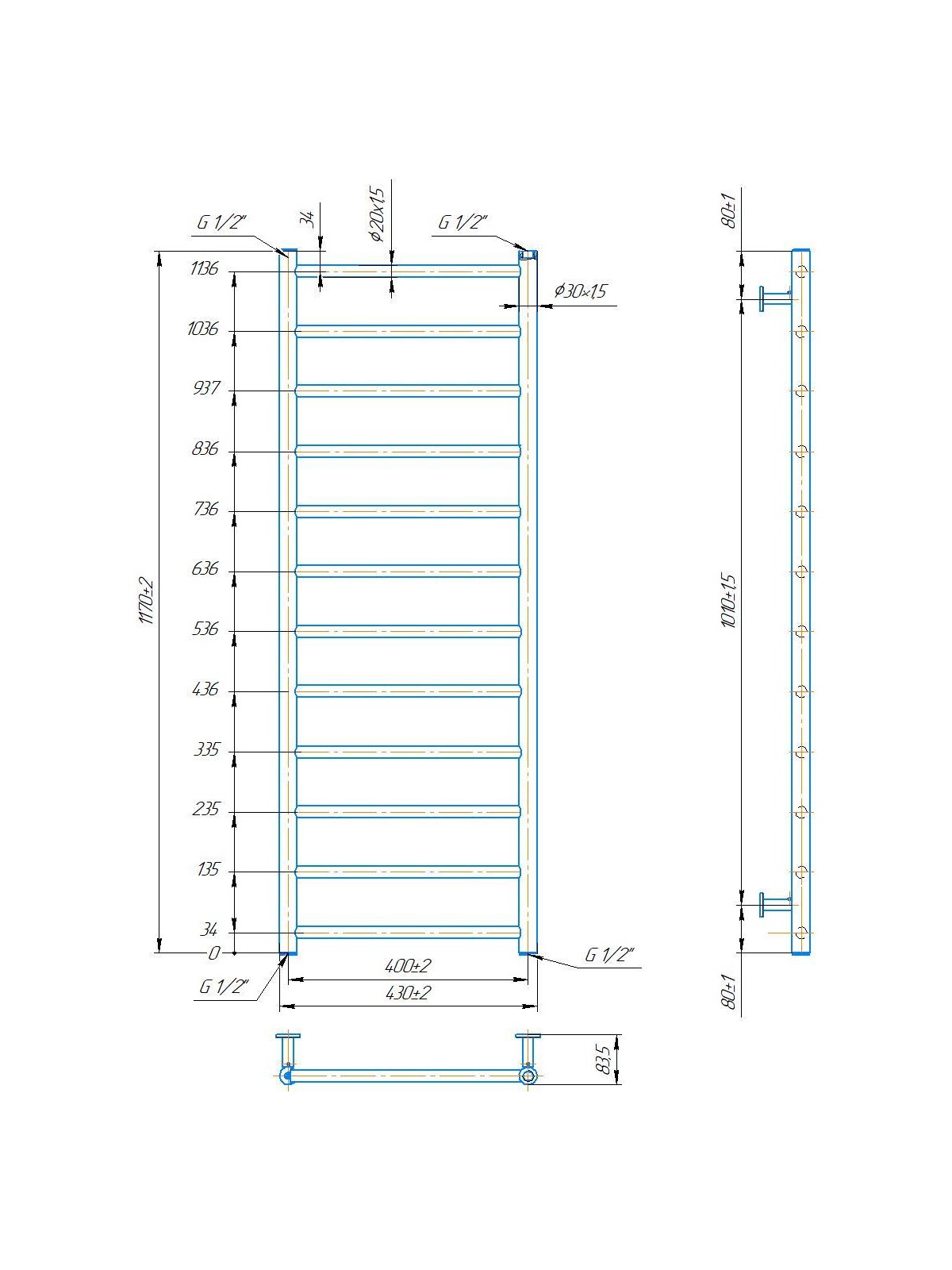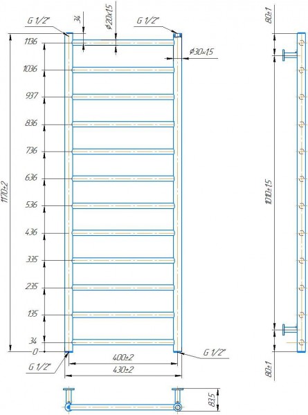 Рушникосушарка INOX Флет 1170х430/400. Розміри: висота - 1 170 мм, ширина - 430 мм, глибина 80 мм, міжцентрова відстань для підключення - 400 мм, діаметр підключення G1/2''. Варіанти підключення: нижнє, діагональне та бічне. Кількість ребер - 12. Виготовлена з полірованої нержавіючої сталі без хромування. Для всесезонної роботи водяну модель можна переобладнати на комбіновану, встановивши ТЕН, рекомендована потужність 300 Вт. Сумісні аксесуари: поворотні полиці та навісні гачки для збільшення функціональності. Рекомендовано підключати рушникосушарку за допомогою кранів Маріо. Гарантія - 50 років в закритій системі опалення, 5 років у централізованій.