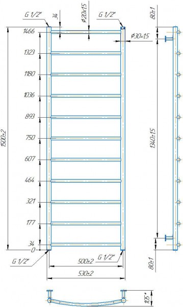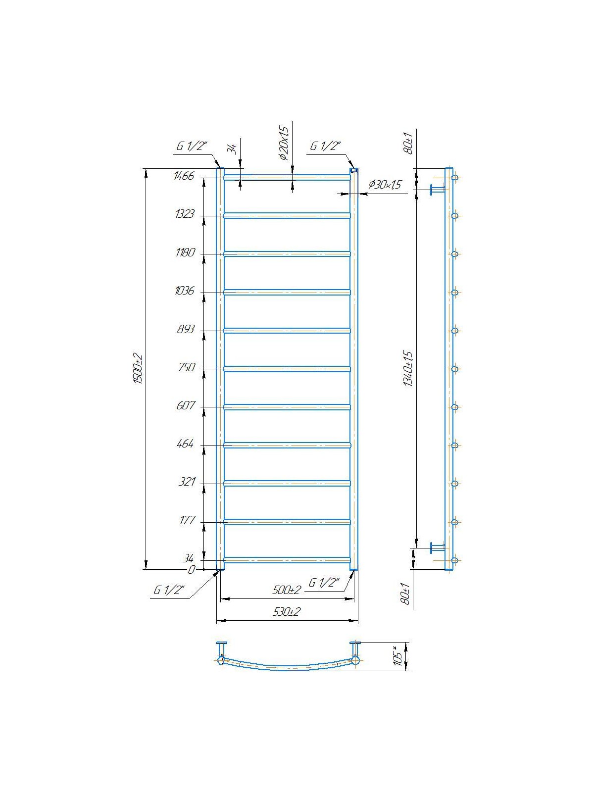 Рушникосушарка INOX Класік HP 1500х530/500. Розміри: висота - 1 500 мм, ширина - 530 мм, глибина 90 мм, міжцентрова відстань для підключення - 500 мм, діаметр підключення G1/2''. Варіанти підключення: нижнє, діагональне та бічне. Кількість ребер - 11. Виготовлена з полірованої нержавіючої сталі без хромування. Для всесезонної роботи водяну модель можна переобладнати на комбіновану, встановивши ТЕН, рекомендована потужність 300 Вт. Сумісні аксесуари: поворотні полиці та навісні гачки для збільшення функціональності. Рекомендовано підключати рушникосушарку за допомогою кранів Маріо. Гарантія - 50 років в закритій системі опалення, 5 років у централізованій.