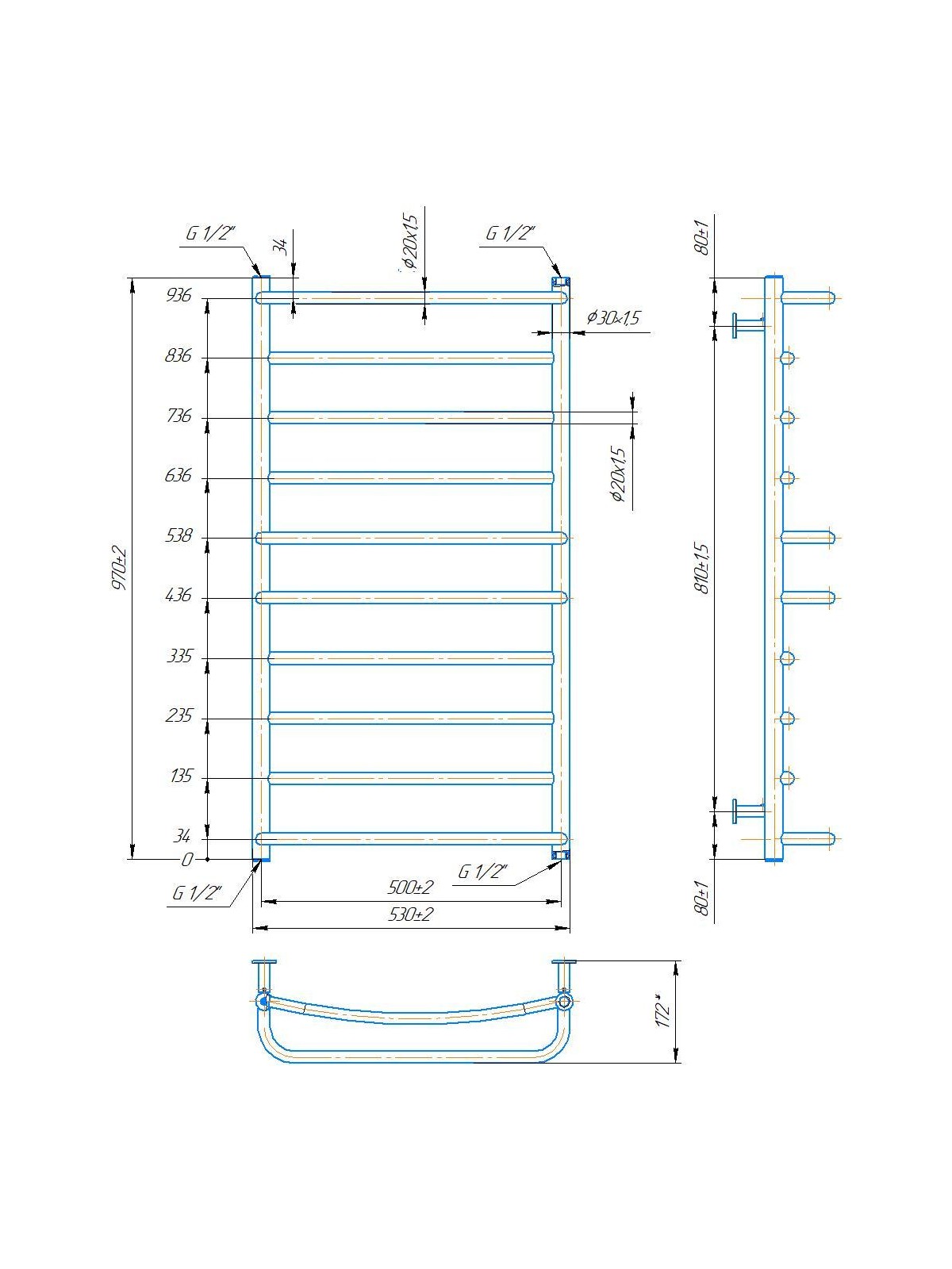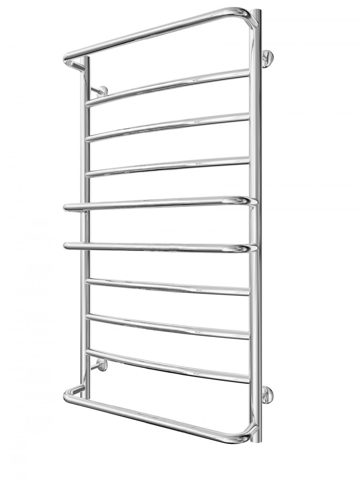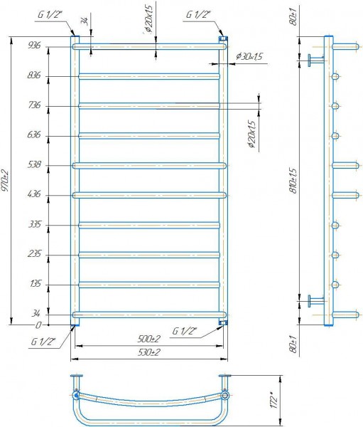 Рушникосушарка INOX Люкс 970х530/500. Розміри: висота - 970 мм, ширина - 530 мм, глибина 160 мм, міжцентрова відстань для підключення - 500 мм, діаметр підключення G1/2''. Варіанти підключення: нижнє, діагональне та бічне. Кількість ребер - 10. Виготовлена з полірованої нержавіючої сталі без хромування. Для всесезонної роботи водяну модель можна переобладнати на комбіновану, встановивши ТЕН, рекомендована потужність . Сумісні аксесуари: поворотні полиці та навісні гачки для збільшення функціональності. Рекомендовано підключати рушникосушарку за допомогою кранів Маріо. Гарантія - 50 років в закритій системі опалення, 5 років у централізованій.