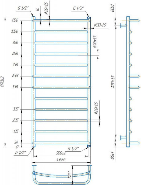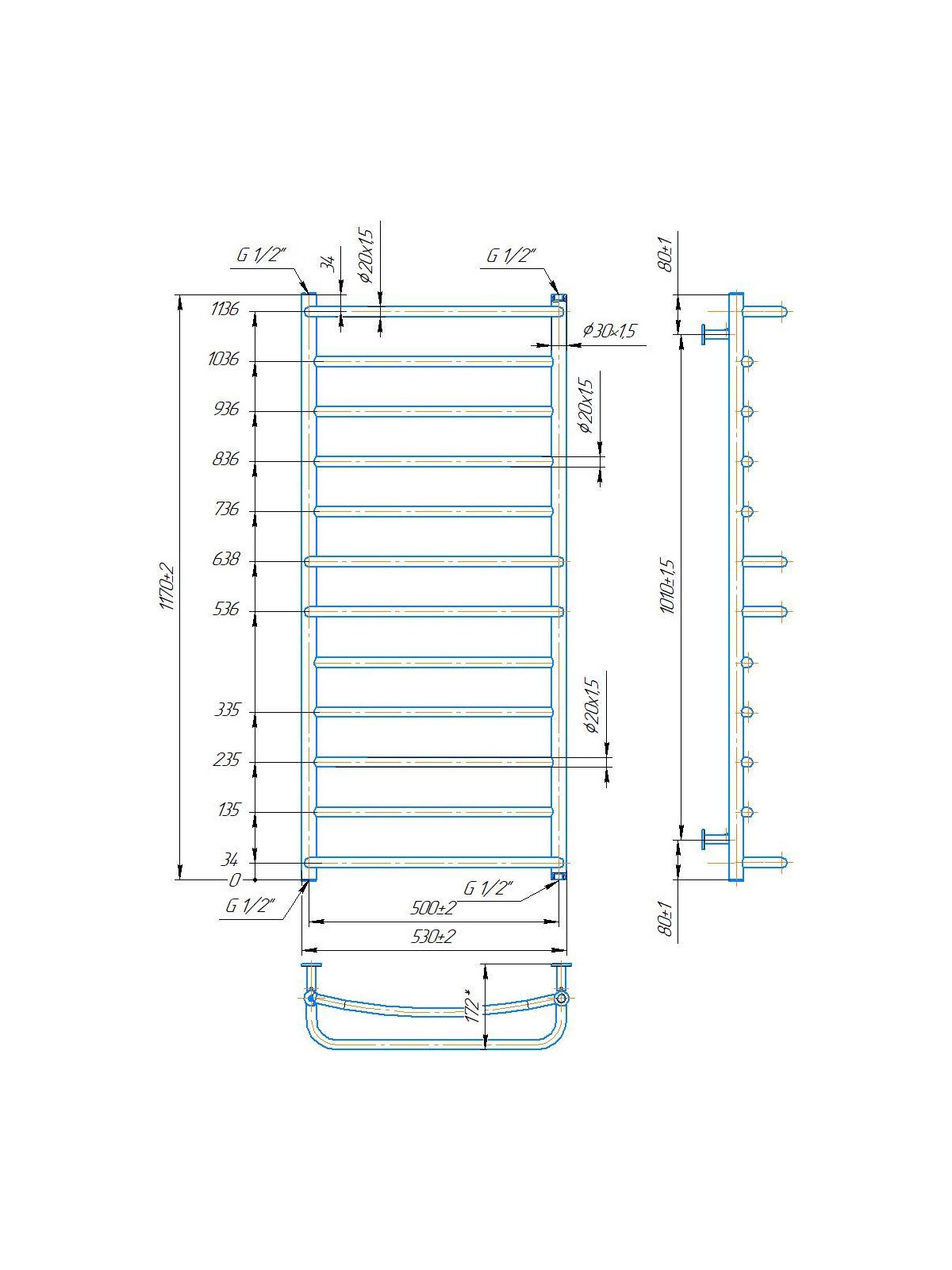Рушникосушарка INOX Люкс 1170х530/500. Розміри: висота - 1 170 мм, ширина - 530 мм, глибина 160 мм, міжцентрова відстань для підключення - 500 мм, діаметр підключення G1/2''. Варіанти підключення: нижнє, діагональне та бічне. Кількість ребер - 12. Виготовлена з полірованої нержавіючої сталі без хромування. Для всесезонної роботи водяну модель можна переобладнати на комбіновану, встановивши ТЕН, рекомендована потужність . Сумісні аксесуари: поворотні полиці та навісні гачки для збільшення функціональності. Рекомендовано підключати рушникосушарку за допомогою кранів Маріо. Гарантія - 50 років в закритій системі опалення, 5 років у централізованій.