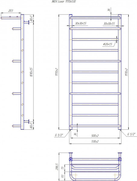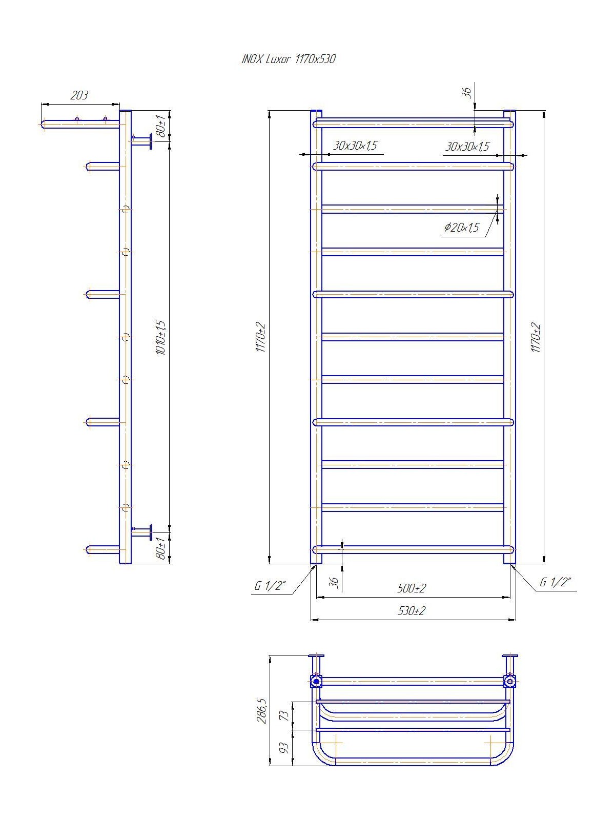 Рушникосушарка INOX Люксор 1170х530/500. Розміри: висота - 1 170 мм, ширина - 530 мм, глибина 260 мм, міжцентрова відстань для підключення - 500 мм, діаметр підключення G1/2''. Варіанти підключення: нижнє, діагональне та бічне. Кількість ребер - 11. Виготовлена з полірованої нержавіючої сталі без хромування. Для всесезонної роботи водяну модель можна переобладнати на комбіновану, встановивши ТЕН, рекомендована потужність 300 Вт. Сумісні аксесуари: поворотні полиці та навісні гачки для збільшення функціональності. Рекомендовано підключати рушникосушарку за допомогою кранів Маріо. Гарантія - 50 років в закритій системі опалення, 5 років у централізованій.
