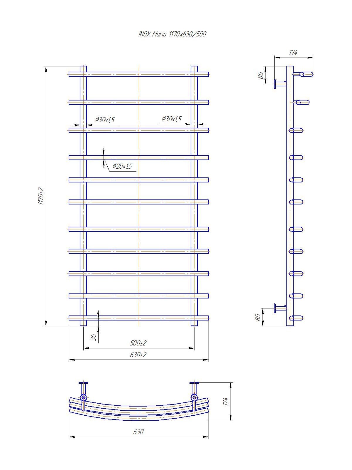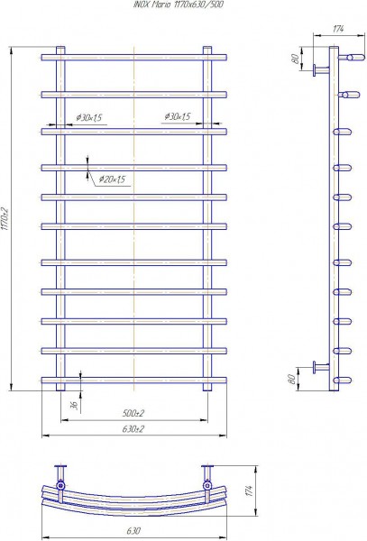 Рушникосушарка INOX Маріо 1170х630/500. Розміри: висота - 1 170 мм, ширина - 630 мм, глибина 170 мм, міжцентрова відстань для підключення - 500 мм, діаметр підключення G1/2''. Варіанти підключення: нижнє, діагональне та бічне. Кількість ребер - 11. Виготовлена з полірованої нержавіючої сталі без хромування. Для всесезонної роботи водяну модель можна переобладнати на комбіновану, встановивши ТЕН, рекомендована потужність 600 Вт. Сумісні аксесуари: поворотні полиці та навісні гачки для збільшення функціональності. Рекомендовано підключати рушникосушарку за допомогою кранів Маріо. Гарантія - 50 років в закритій системі опалення, 5 років у централізованій.