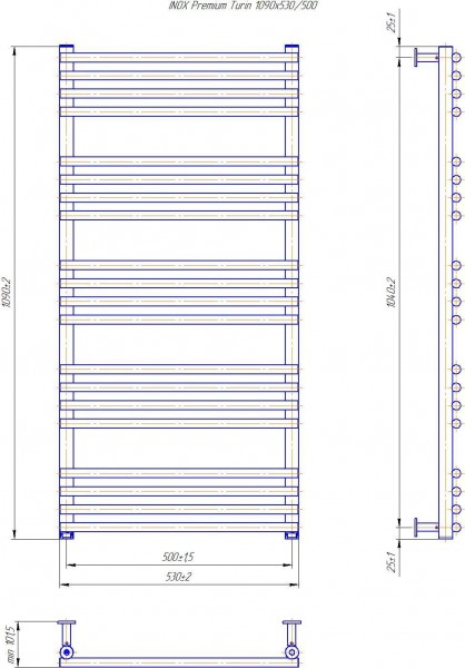 Рушникосушарка INOX Преміум Турин 1090х530/500. Розміри: висота - 1 090 мм, ширина - 530 мм, глибина 80 мм, міжцентрова відстань для підключення - 500 мм, діаметр підключення G1/2''. Варіанти підключення: нижнє, діагональне та бічне. Кількість ребер - 20. Виготовлена з полірованої нержавіючої сталі без хромування. Для всесезонної роботи водяну модель можна переобладнати на комбіновану, встановивши ТЕН, рекомендована потужність 600 Вт. Сумісні аксесуари: поворотні полиці та навісні гачки для збільшення функціональності. Рекомендовано підключати рушникосушарку за допомогою кранів Маріо. Гарантія - 50 років в закритій системі опалення, 5 років у централізованій.