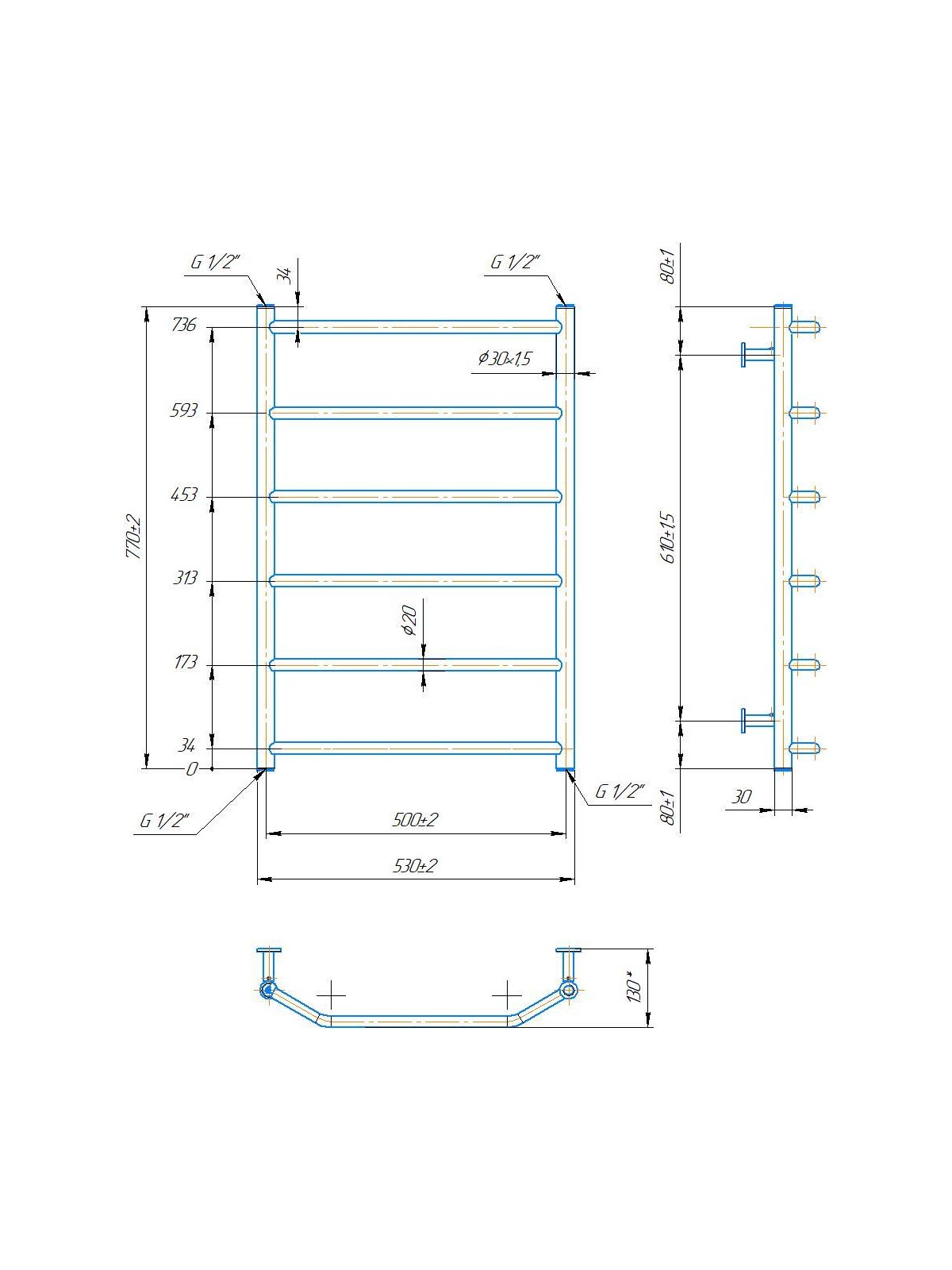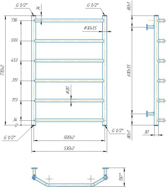 Рушникосушарка INOX Трапеція 770х530/500. Розміри: висота - 770 мм, ширина - 530 мм, глибина 130 мм, міжцентрова відстань для підключення - 500 мм, діаметр підключення G1/2''. Варіанти підключення: нижнє, діагональне та бічне. Кількість ребер - 6. Виготовлена з полірованої нержавіючої сталі без хромування. Для всесезонної роботи водяну модель можна переобладнати на комбіновану, встановивши ТЕН, рекомендована потужність 300 Вт. Сумісні аксесуари: поворотні полиці та навісні гачки для збільшення функціональності. Рекомендовано підключати рушникосушарку за допомогою кранів Маріо. Гарантія - 50 років в закритій системі опалення, 5 років у централізованій.