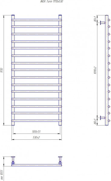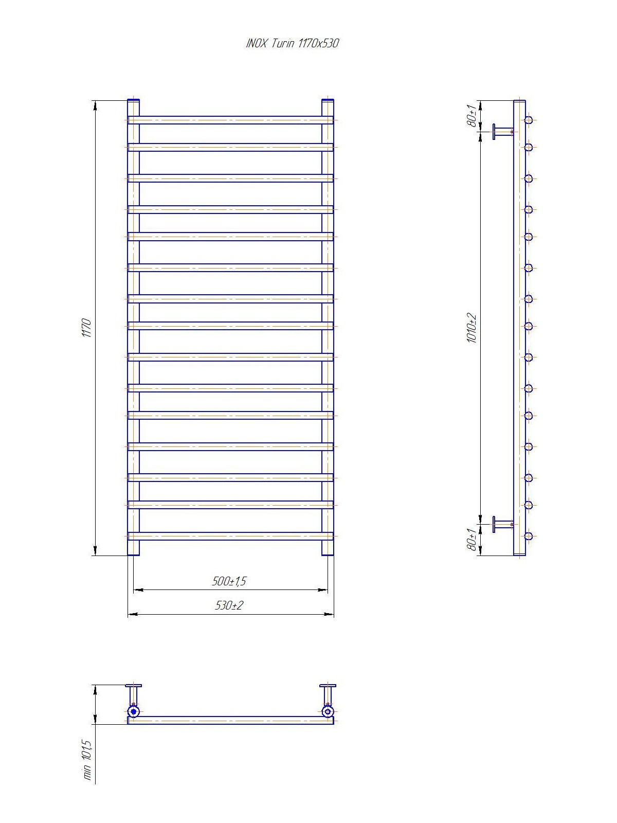 Рушникосушарка INOX Турин 1170х530/500. Розміри: висота - 1 170 мм, ширина - 530 мм, глибина 80 мм, міжцентрова відстань для підключення - 500 мм, діаметр підключення G1/2''. Варіанти підключення: нижнє, діагональне та бічне. Кількість ребер - 15. Виготовлена з полірованої нержавіючої сталі без хромування. Для всесезонної роботи водяну модель можна переобладнати на комбіновану, встановивши ТЕН, рекомендована потужність 600 Вт. Сумісні аксесуари: поворотні полиці та навісні гачки для збільшення функціональності. Рекомендовано підключати рушникосушарку за допомогою кранів Маріо. Гарантія - 50 років в закритій системі опалення, 5 років у централізованій.