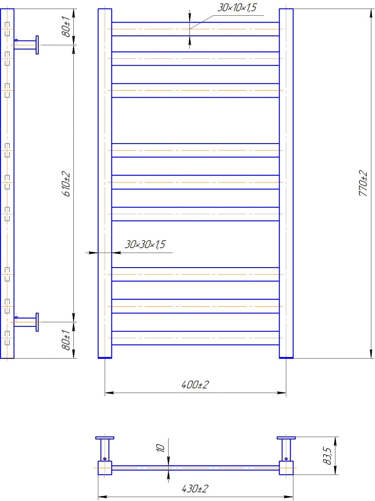 Рушникосушарка INOX Чикаго 770х430/400. Розміри: висота - 770 мм, ширина - 430 мм, глибина 80 мм, міжцентрова відстань для підключення - 400 мм, діаметр підключення G1/2''. Варіанти підключення: нижнє, діагональне та бічне. Кількість ребер - 9. Виготовлена з полірованої нержавіючої сталі без хромування. Для всесезонної роботи водяну модель можна переобладнати на комбіновану, встановивши ТЕН, рекомендована потужність 300 Вт. Сумісні аксесуари: поворотні полиці та навісні гачки для збільшення функціональності. Рекомендовано підключати рушникосушарку за допомогою кранів Маріо. Гарантія - 50 років в закритій системі опалення, 5 років у централізованій.