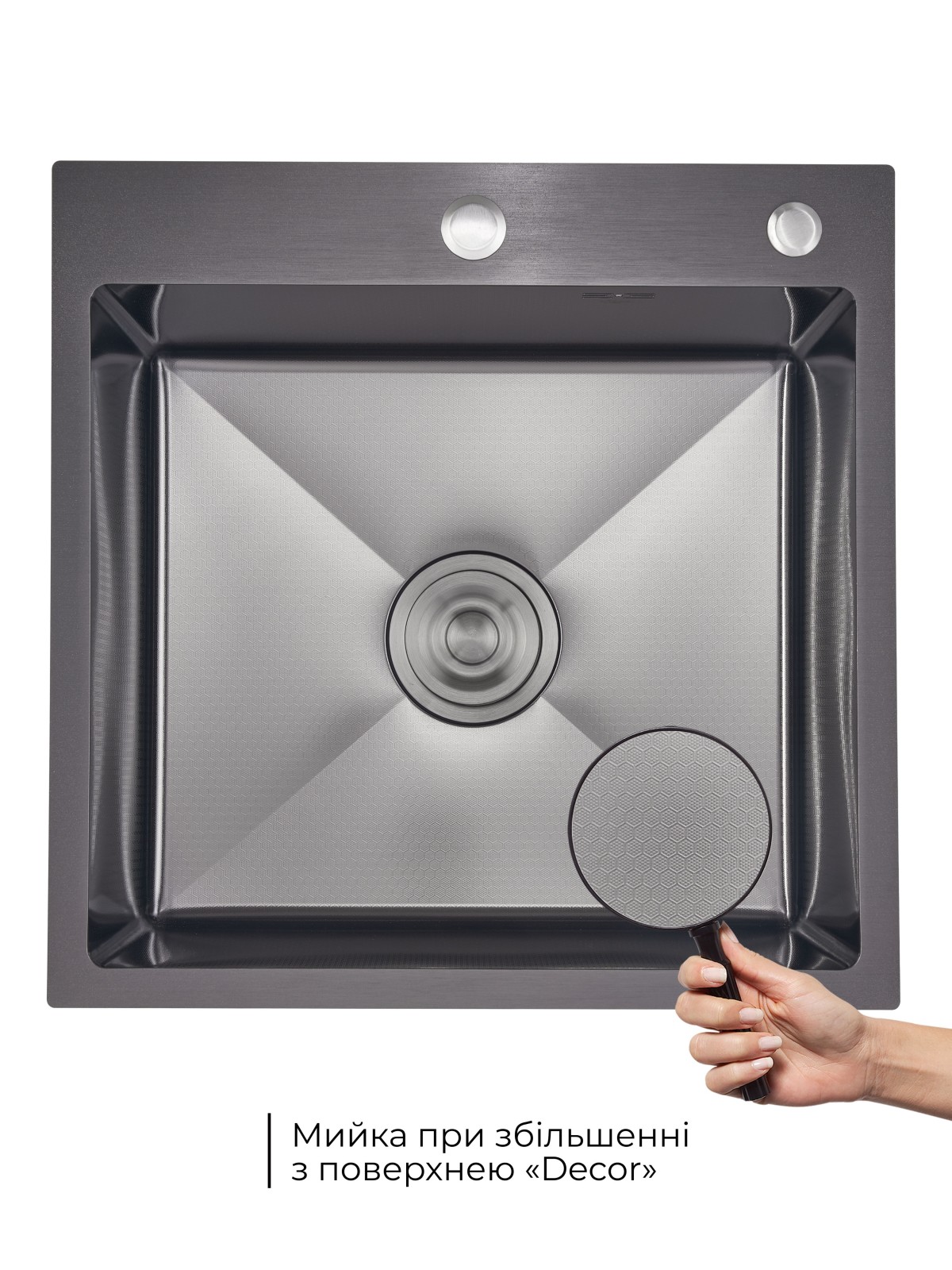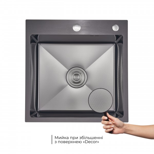 Мийка Lidz Handmade з поверхнею Decor Black PVD Honeycomb. Чорне покриття підкреслює преміальний стиль, а товщина сталі 2,5/0,5 мм забезпечує стійкість до пошкоджень і тривалий термін служби. Ефектна поверхня робить модель яскравим акцентом на кухні.