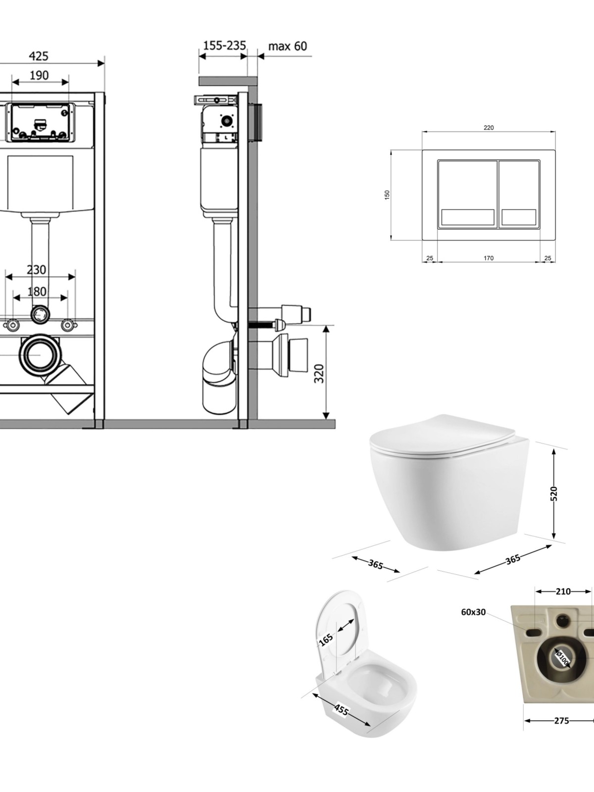 Габаритні розміри виробу (ШхГхВ), мм: 365х520х365 - унитаз; 425х185х1280 - инсталляция; 220х13х150 - панель смыва