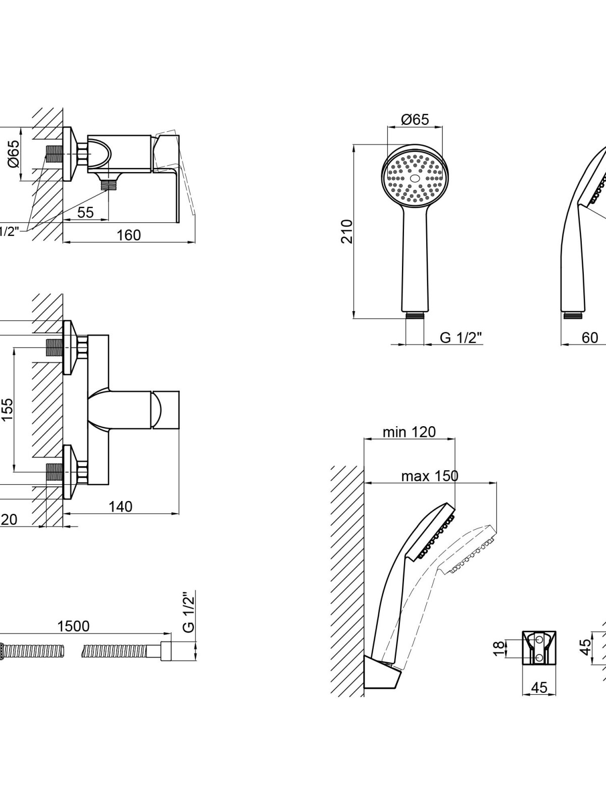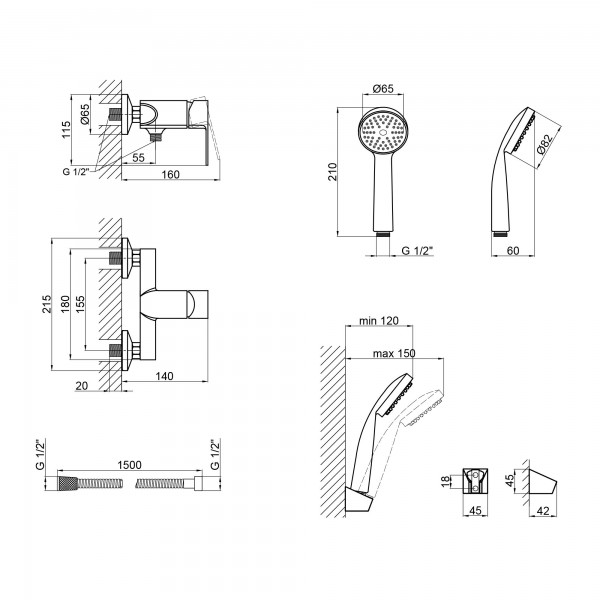 Комплектація: Змішувач, душовий шланг, лійка для ручного душу, кронштейн для ручного душу, кріплення.