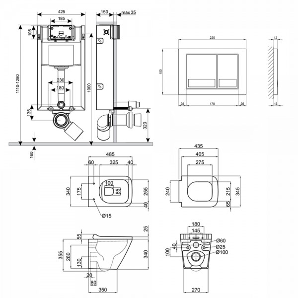 Габаритні розміри виробу (ШхГхВ), мм: Інсталяція: 1280х425х235. Панель змиву: 150х220х13. Унітаз: 355х340х485. Сидіння: 55х345х435.