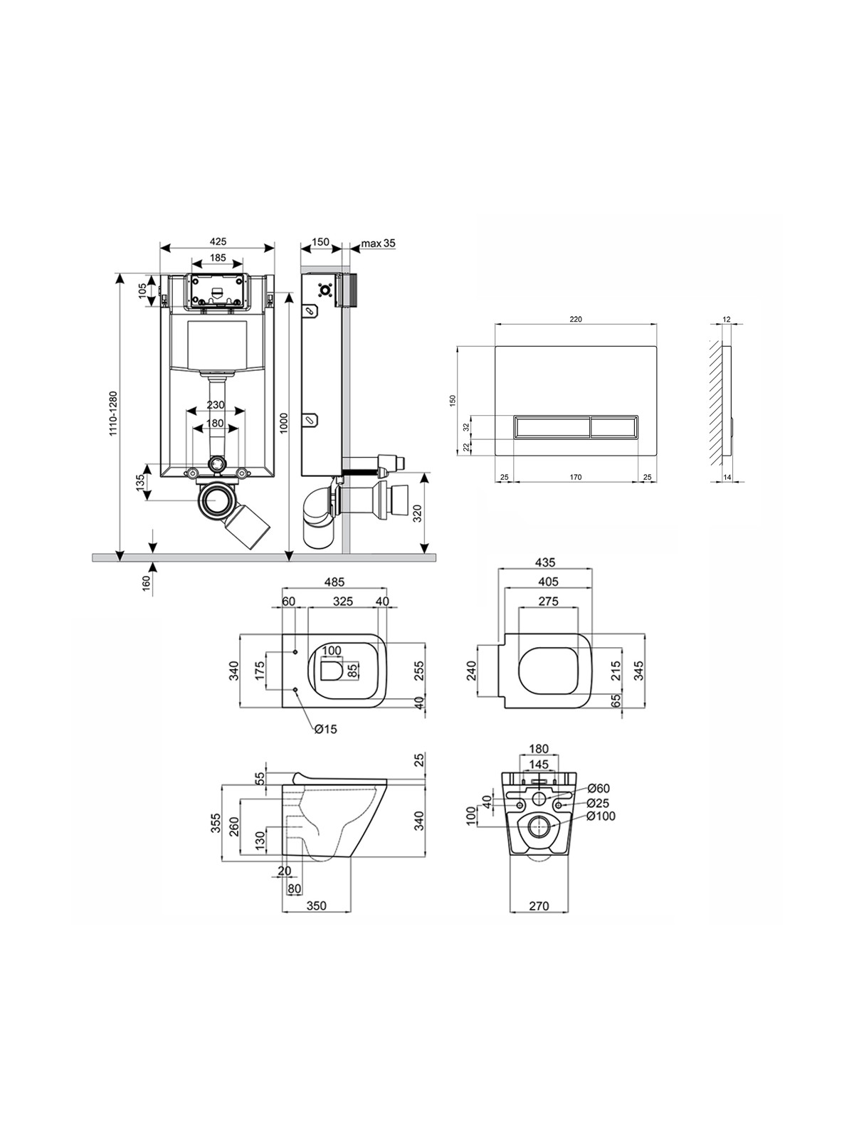 Габаритні розміри виробу (ШхГхВ), мм: Інсталяція: 1280х425х235. Панель змиву: 150х220х14. Унітаз: 355х340х485. Сидіння: 55х345х435.