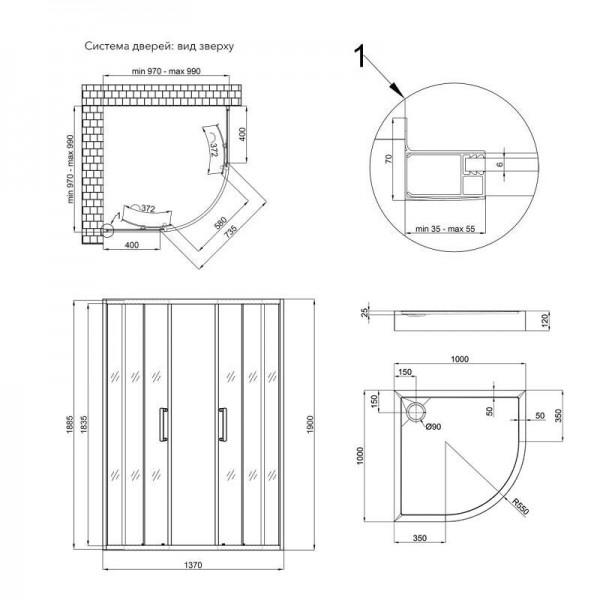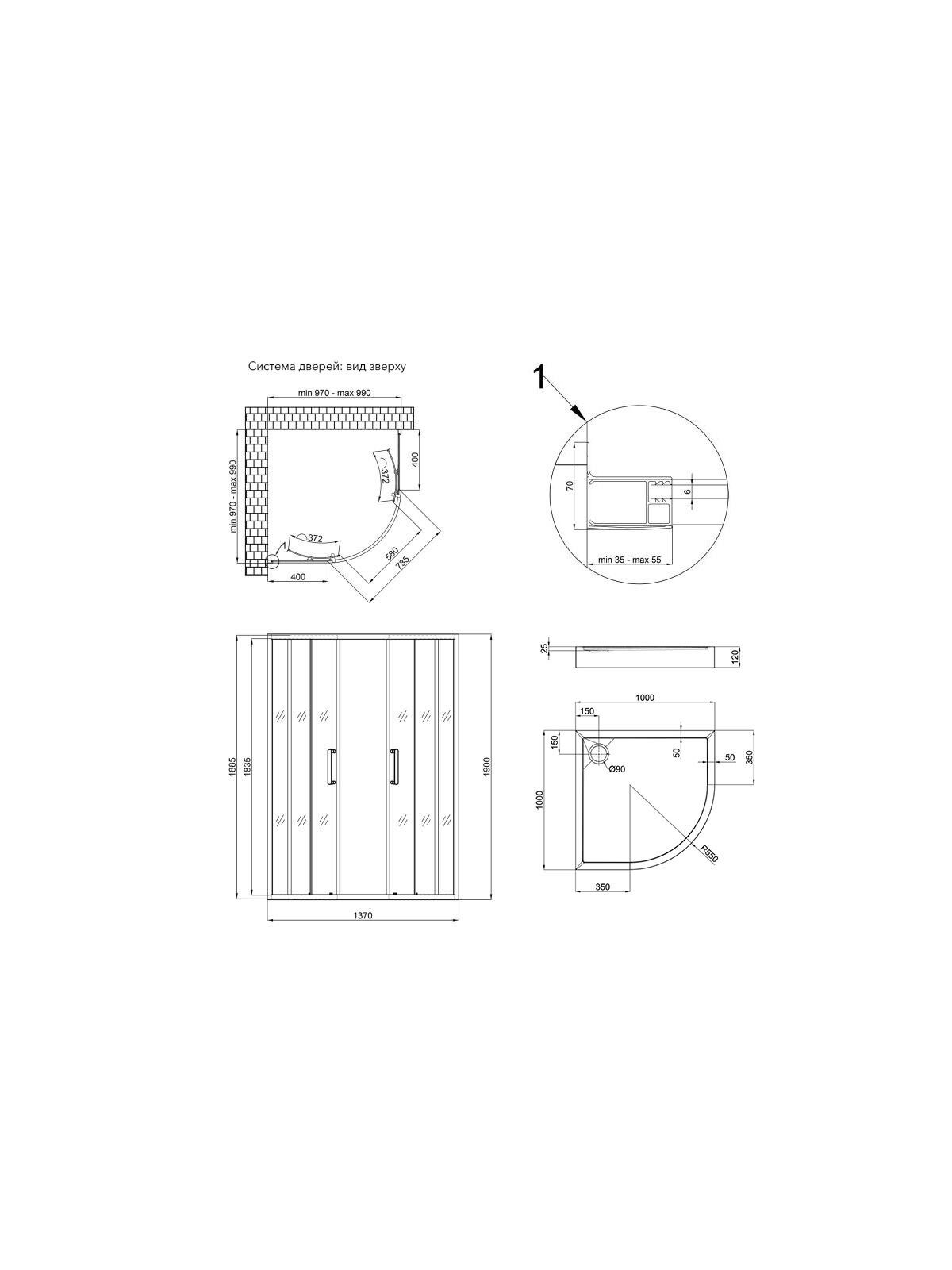 Комплектація: Подвійні ролики, ручки, верхній профіль, нижній профіль, бічні профілі, набір ущільнювачів, 2 скляні двері, 2 глухі скла, комплект кріплень, заглушки, елементи, що з'єднують, фіксатори. Піддон, ніжки, сифон із гідрозатвором.