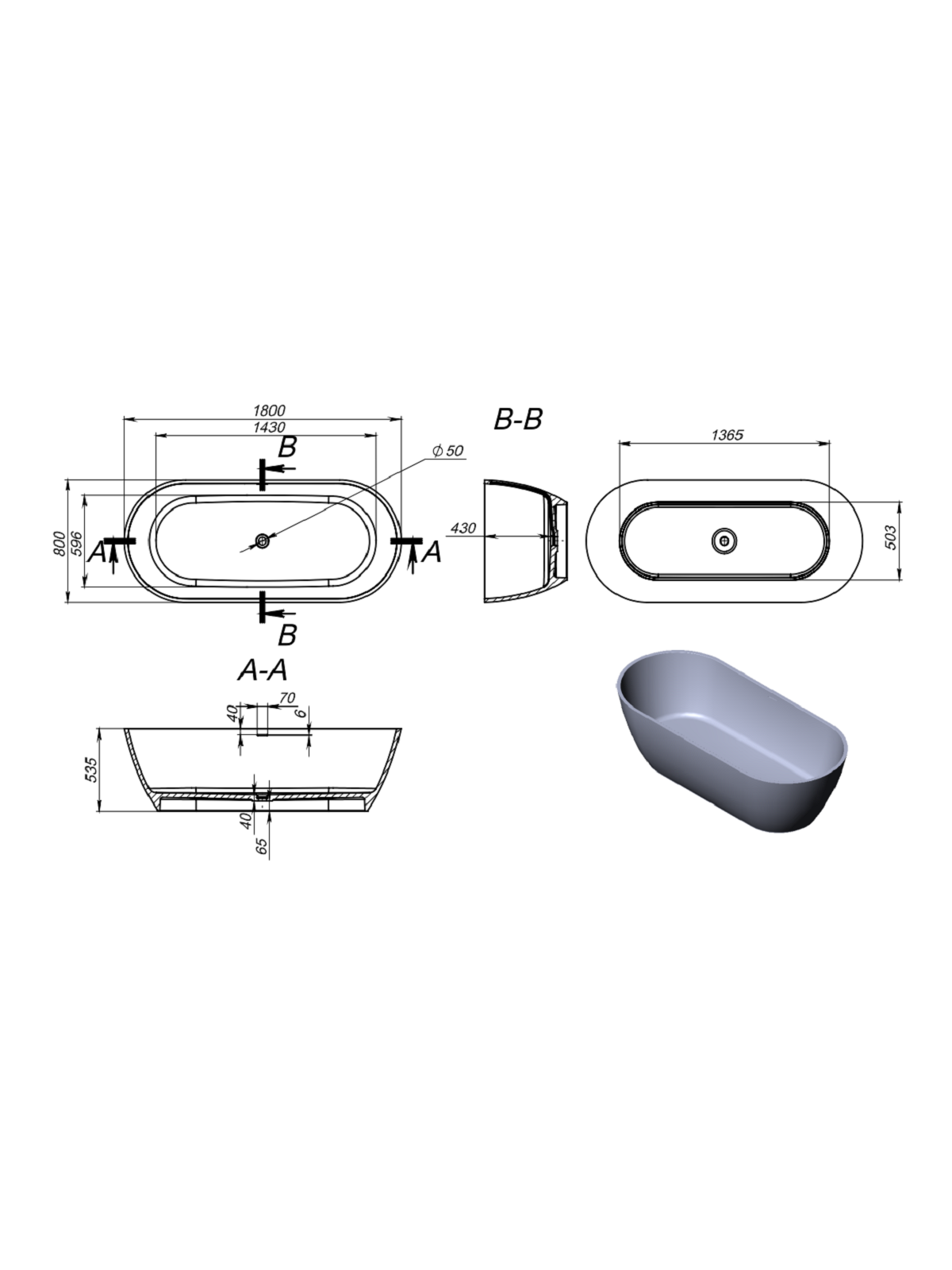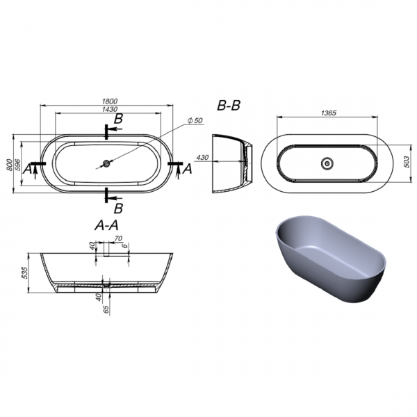 18080110UM Ванна Laguna штучний камінь без сифона 1800*797*530 мм, біла матова (1 сорт)