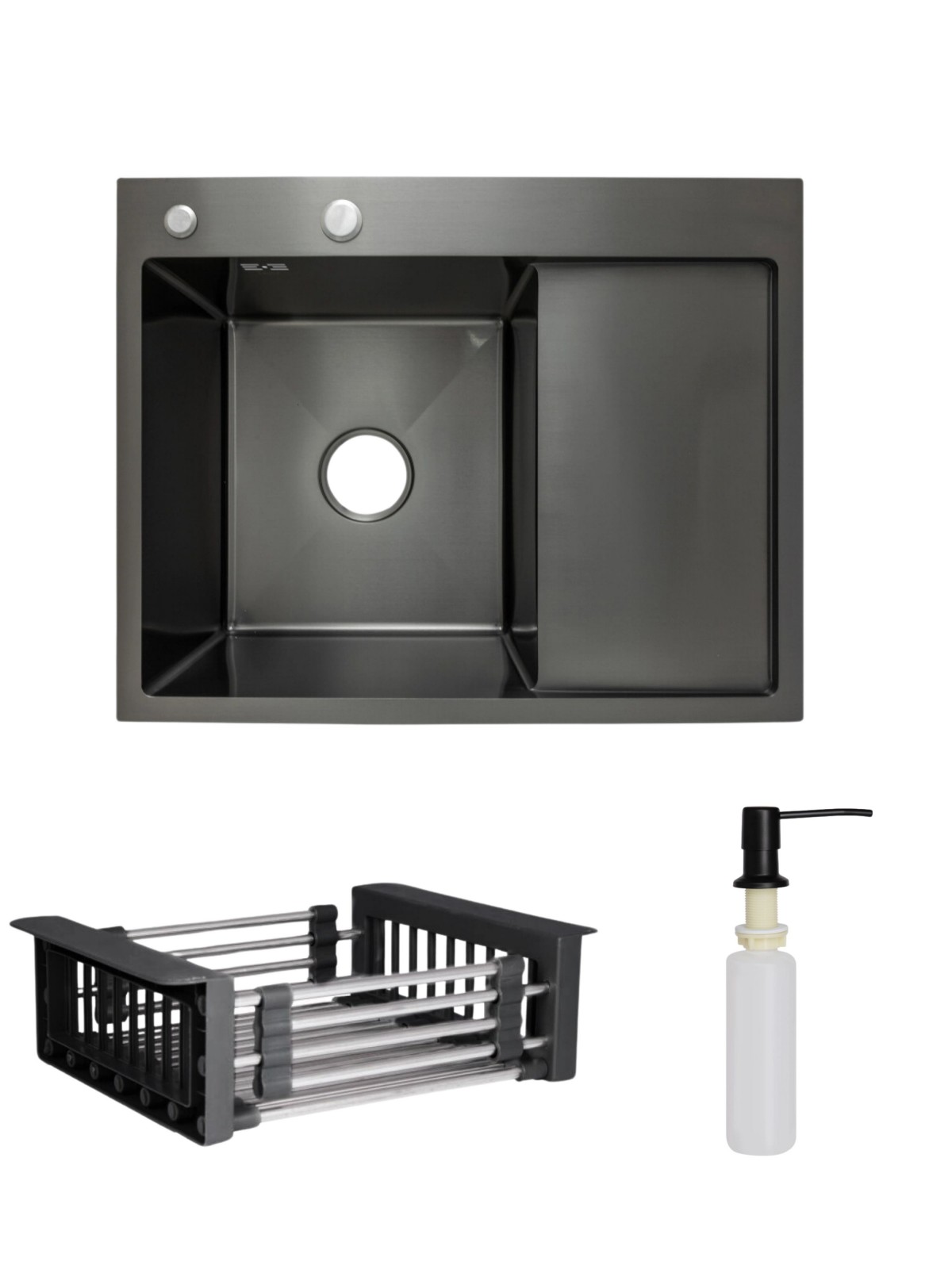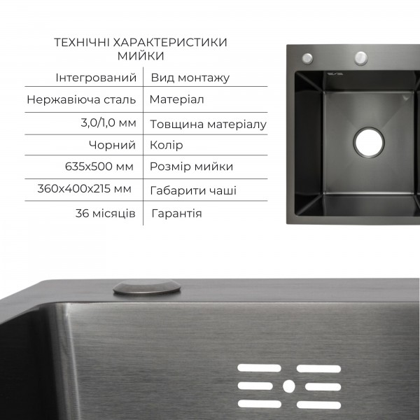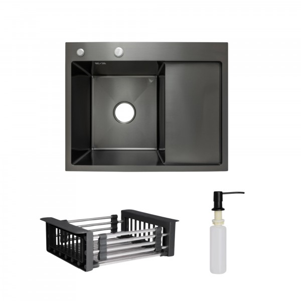 Комплект Lidz Handmade H6350BR (BlackPVD) включає чорну мийку з правим крилом, дозатор і кошик Lidz K01B. Прекрасний вибір для любителів лаконічного дизайну.