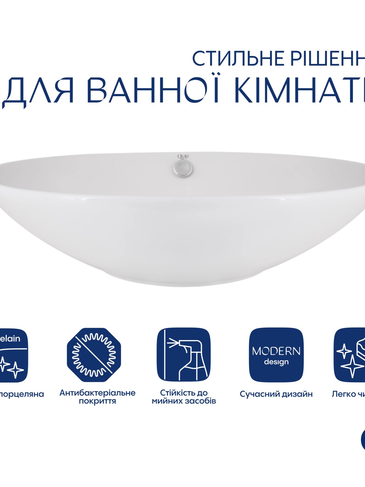 Комплект Qtap Dove: Раковина накладна овальна White + Донний клапан PU02O: У цьому наборі представлена велика овальна раковина у білому кольорі та донний клапан PU02O. Її елегантна форма і місткість забезпечують комфорт в експлуатації, роблячи комплект ідеальним для просторих ванних кімнат.