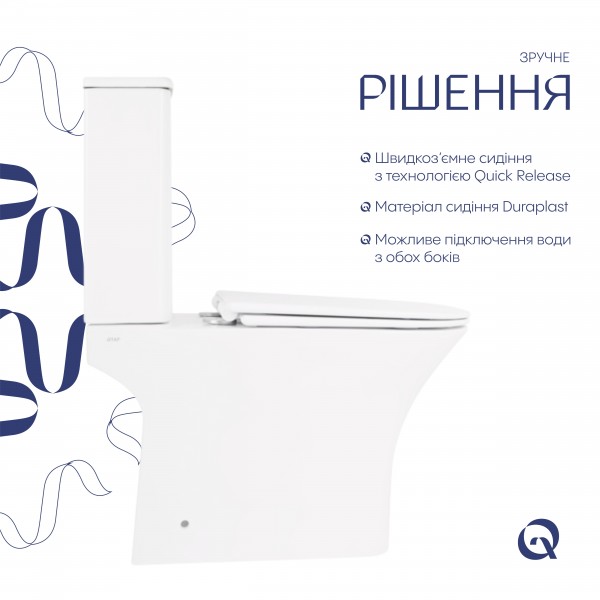 Унітаз-компакт Qtap Presto Quadro Presto Quadro з сидінням QT24221215AW має класичний дизайн, тому буде доречний у будь-якому сучасному інтер'єрі. Чаша унітазу безободкова, що унеможливлює скупчення зайвого бруду та дає змогу очистити виріб без особливих зусиль. Сидіння з функцією Soft-close опускається плавно і безшумно. Спеціальне гігієнічне кріплення Quick release дає змогу максимально швидко зняти або встановити сидіння на унітаз. Виріб виготовлено з кераміки білого кольору та вкрито захисною емаллю.