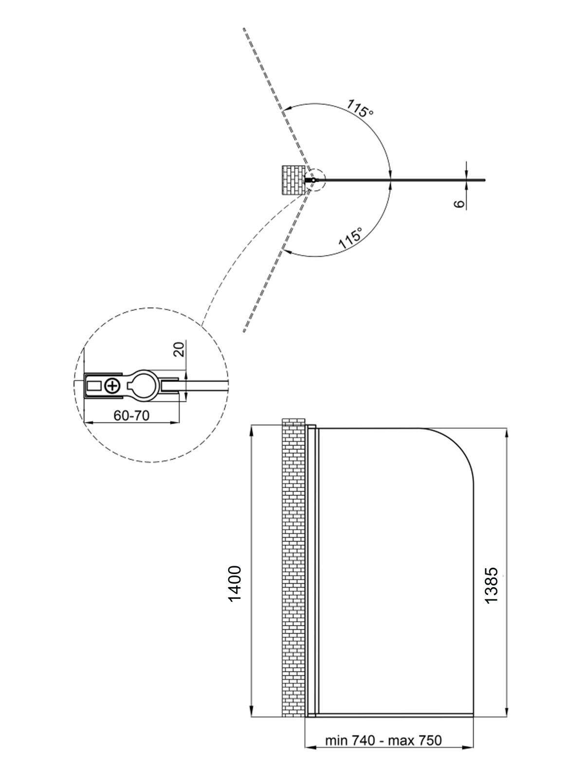 Габаритні розміри виробу (ШхГхВ), мм: 740-750х20х1400
