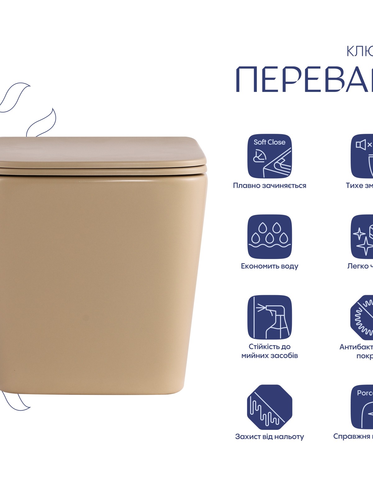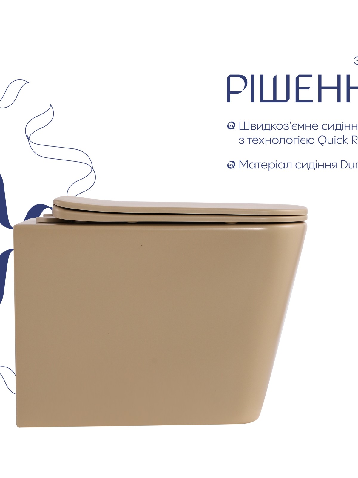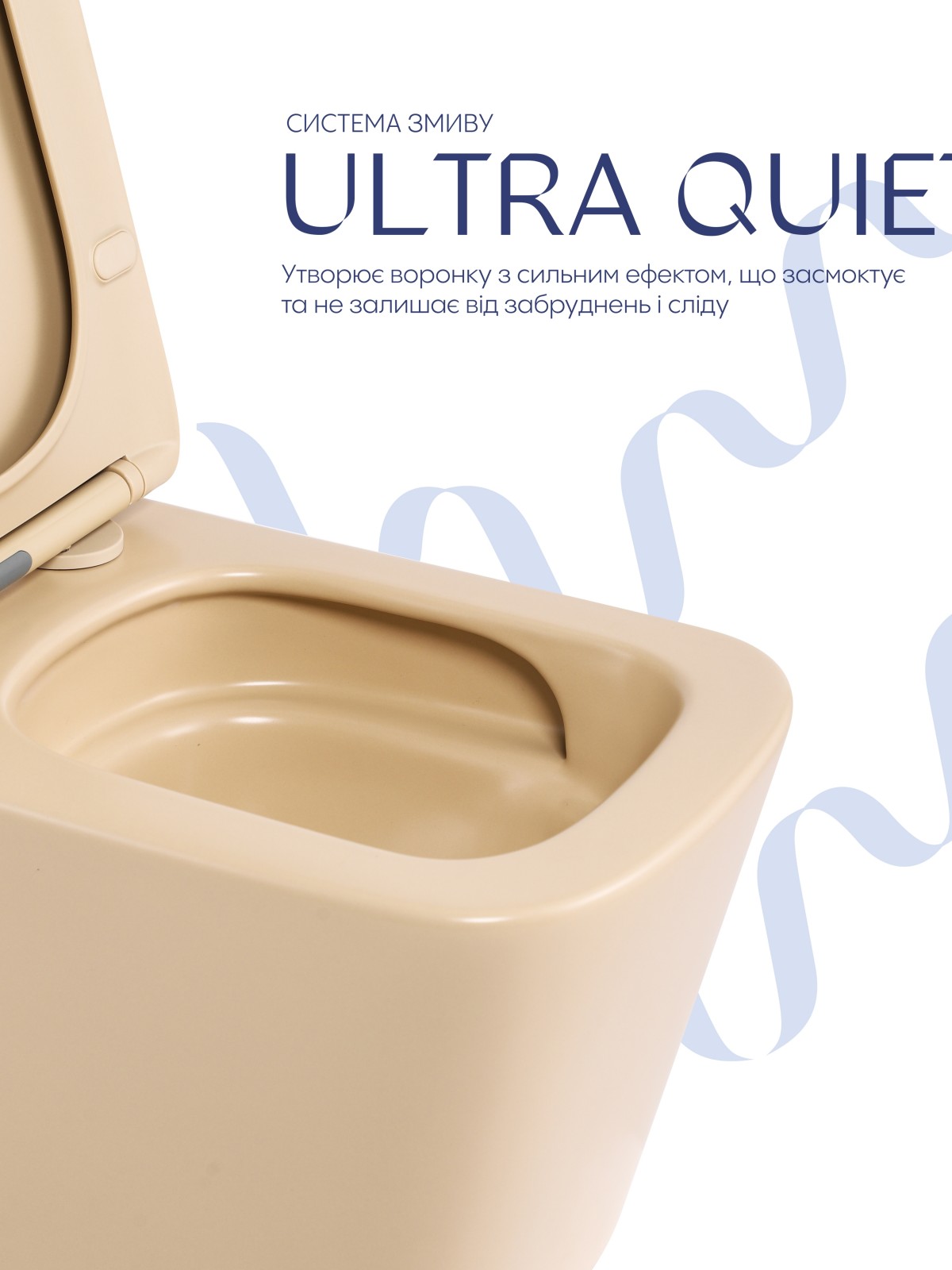 Підвісний унітаз Qtap Tern Ultra Quiet у бежевому кольорі поєднує стильний дизайн і практичність. Він виготовлений із міцної кераміки, стійкої до вологи та простої в догляді. У комплект входить сидіння Slim із дюропласту з функціями Soft-close і Quick Release, що робить використання комфортним і зручним в обслуговуванні.