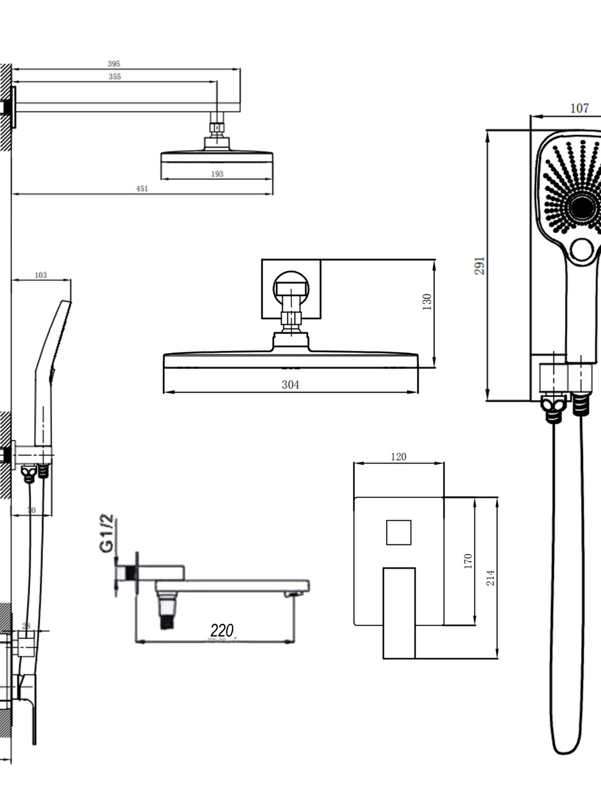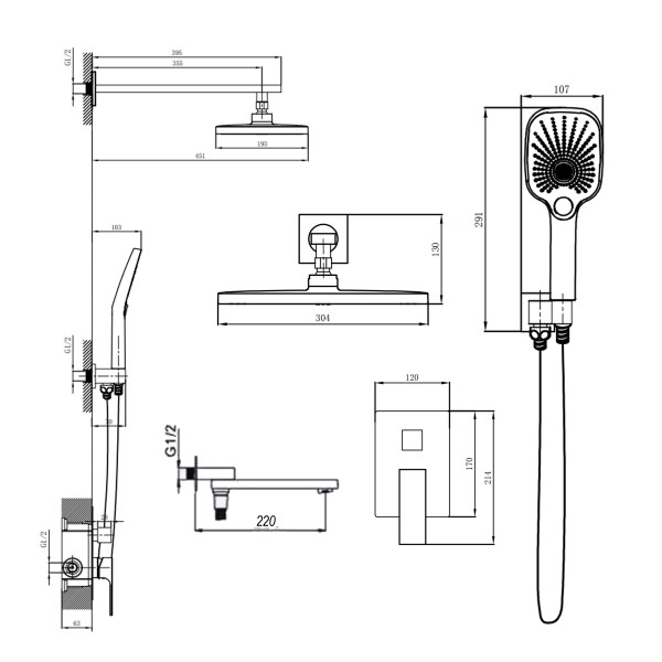Комплектація: Змішувач, вилив, лійка для ручного душу, душовий шланг, кронштейн, кріпильні деталі.