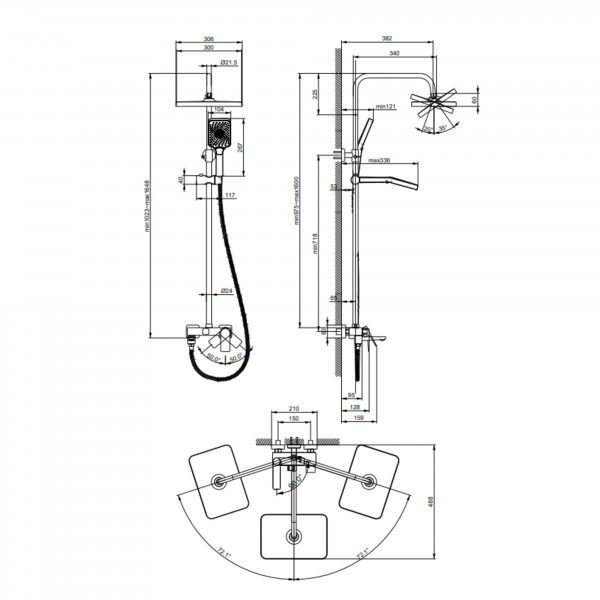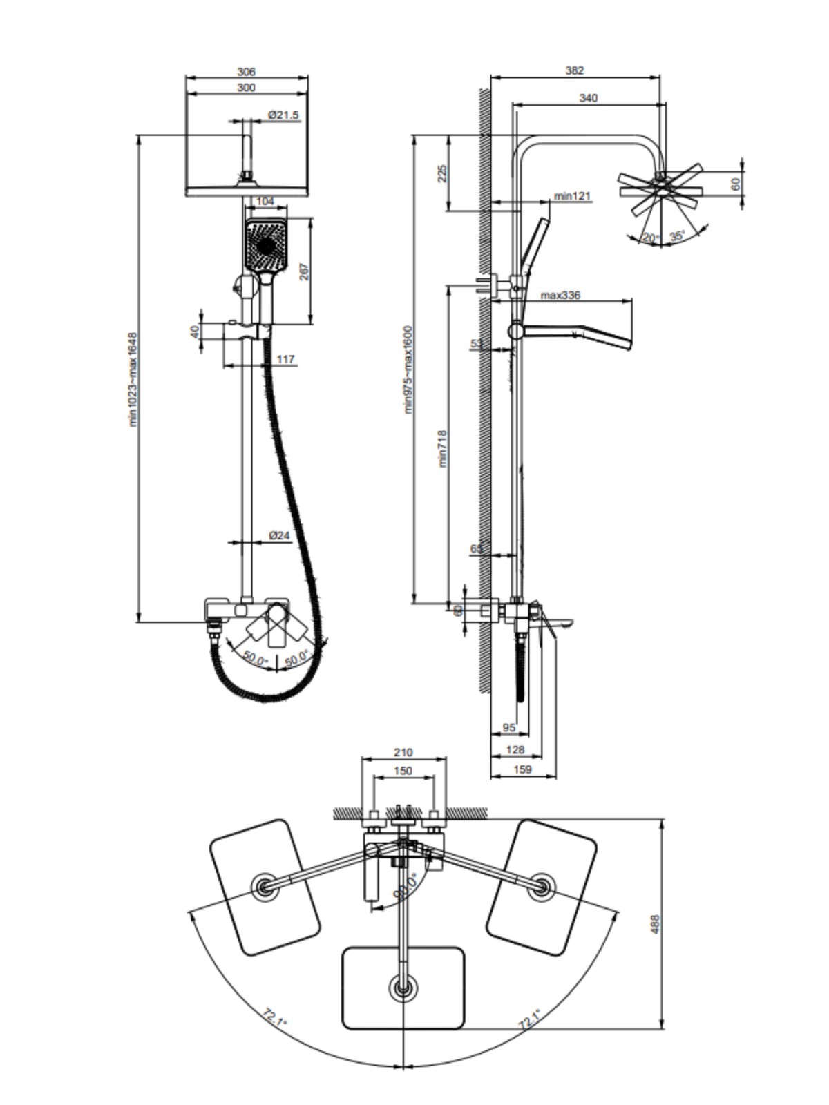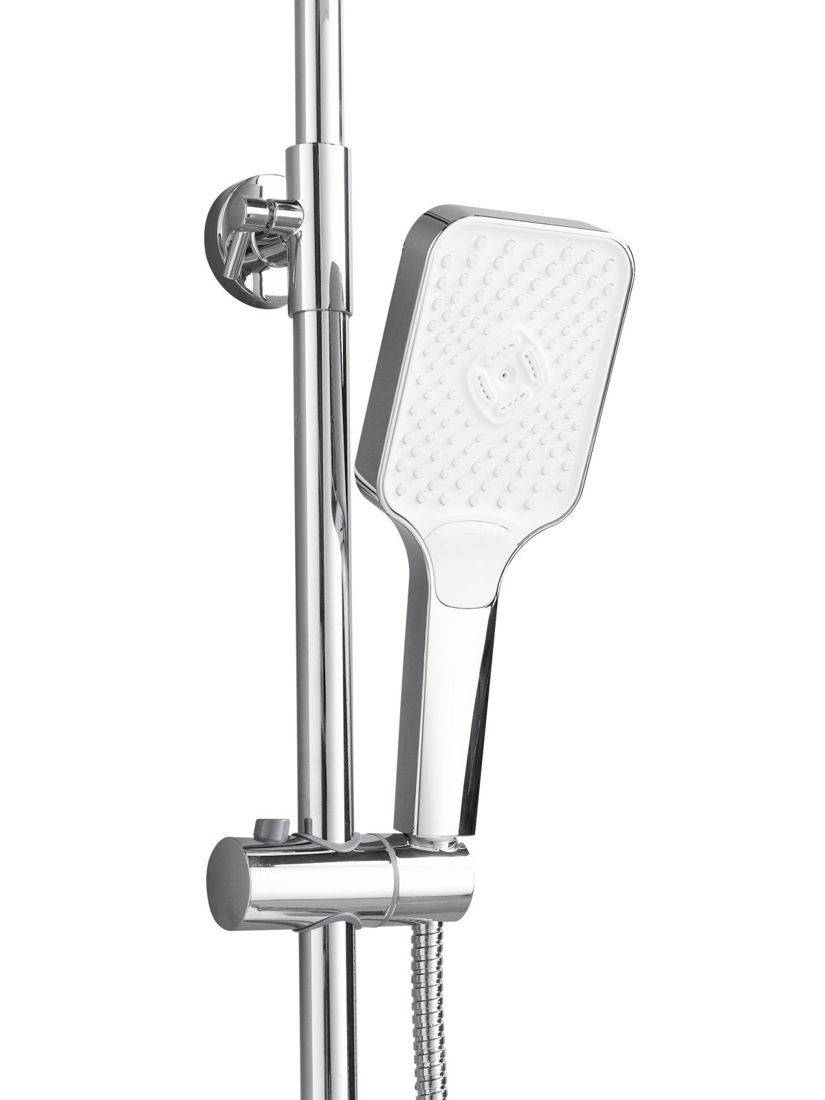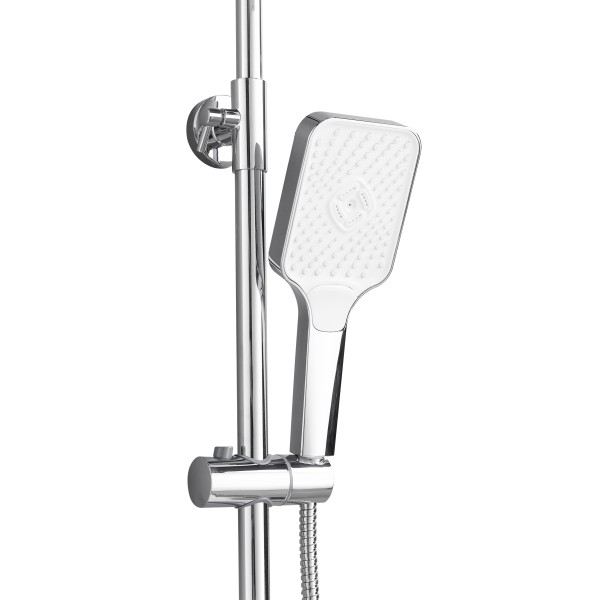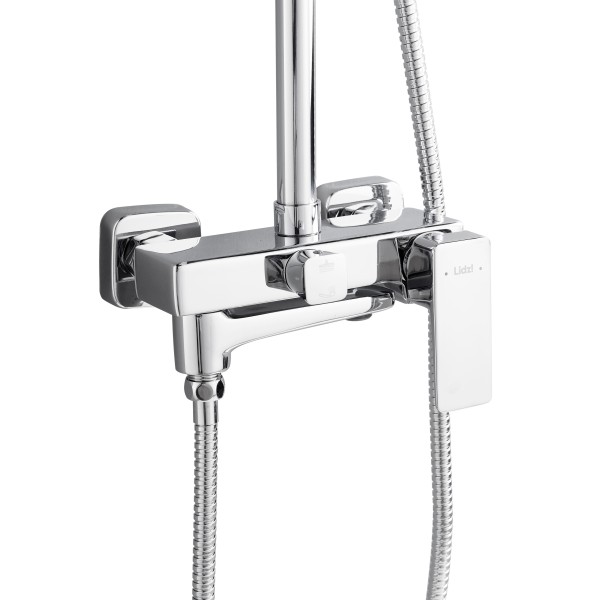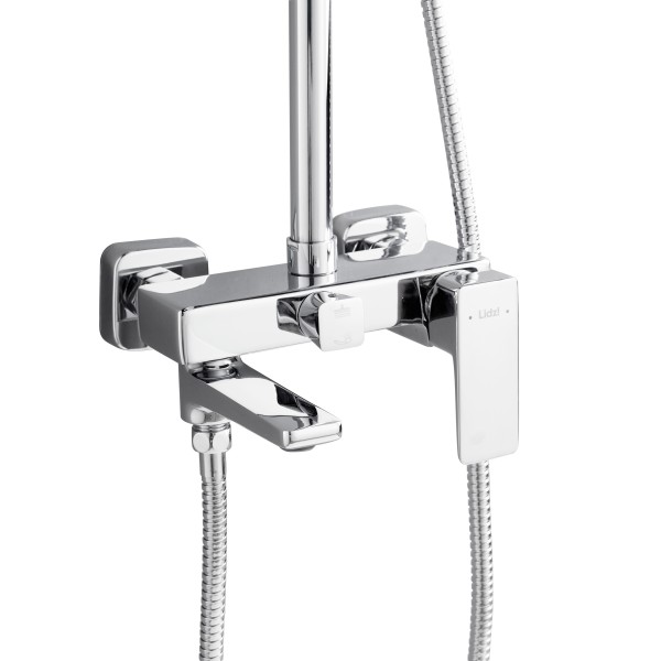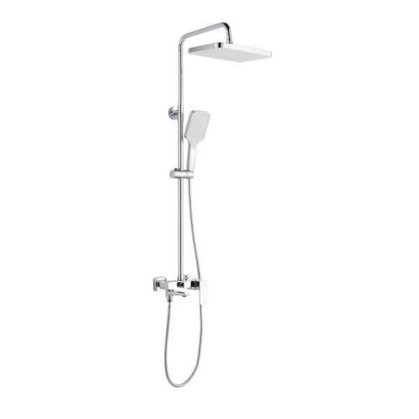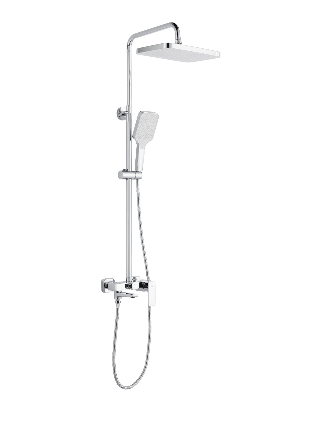Комплектація: Змішувач, вилив, душова стійка - 3 секції, верхня лійка, ручна лійка, душовий шланг, декоративні чашки (розетки) - 2 шт, ексцентрики (перехідники) - 2 шт, ущільнювальні прокладки - 2 шт, тримач для ручної лійки, кріплення для стійки.