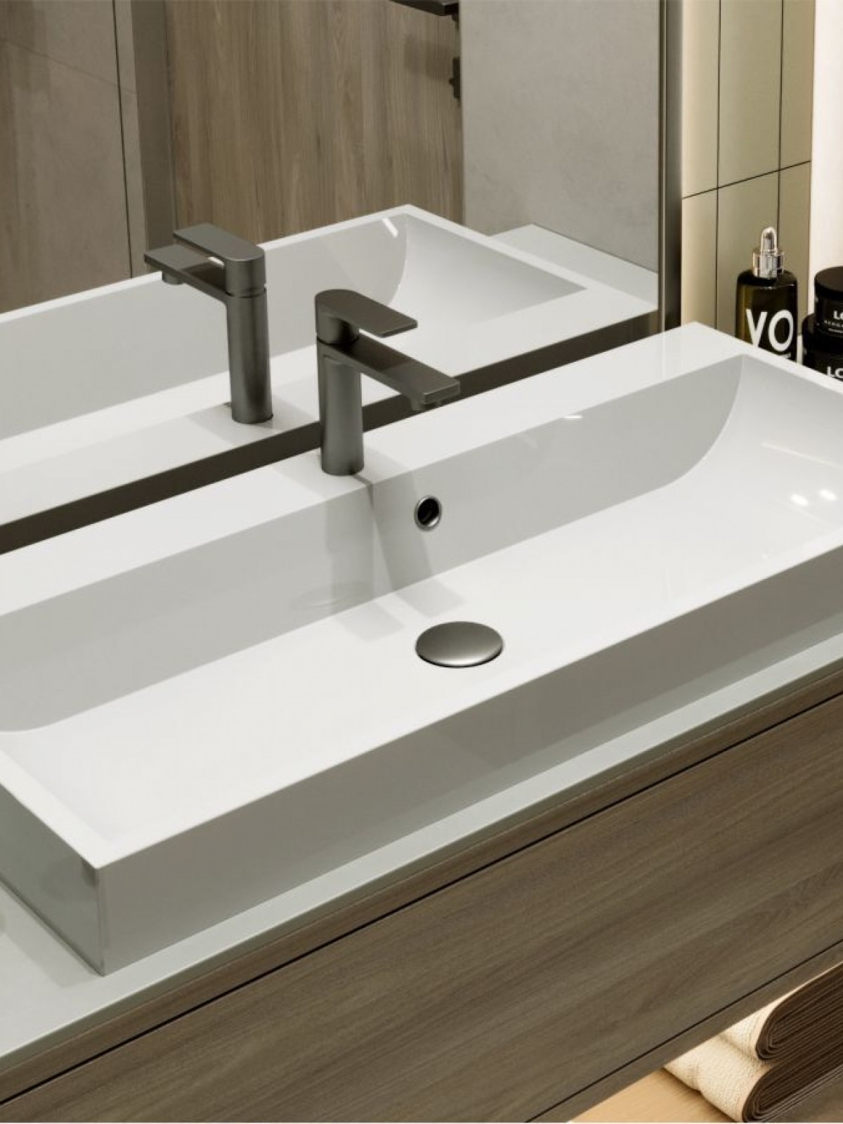 Прямокутний за формою чаші раковина має тип монтажу - врізний;на тумбу, врахуйте це перед замовленням меблів у ванну кімнату.