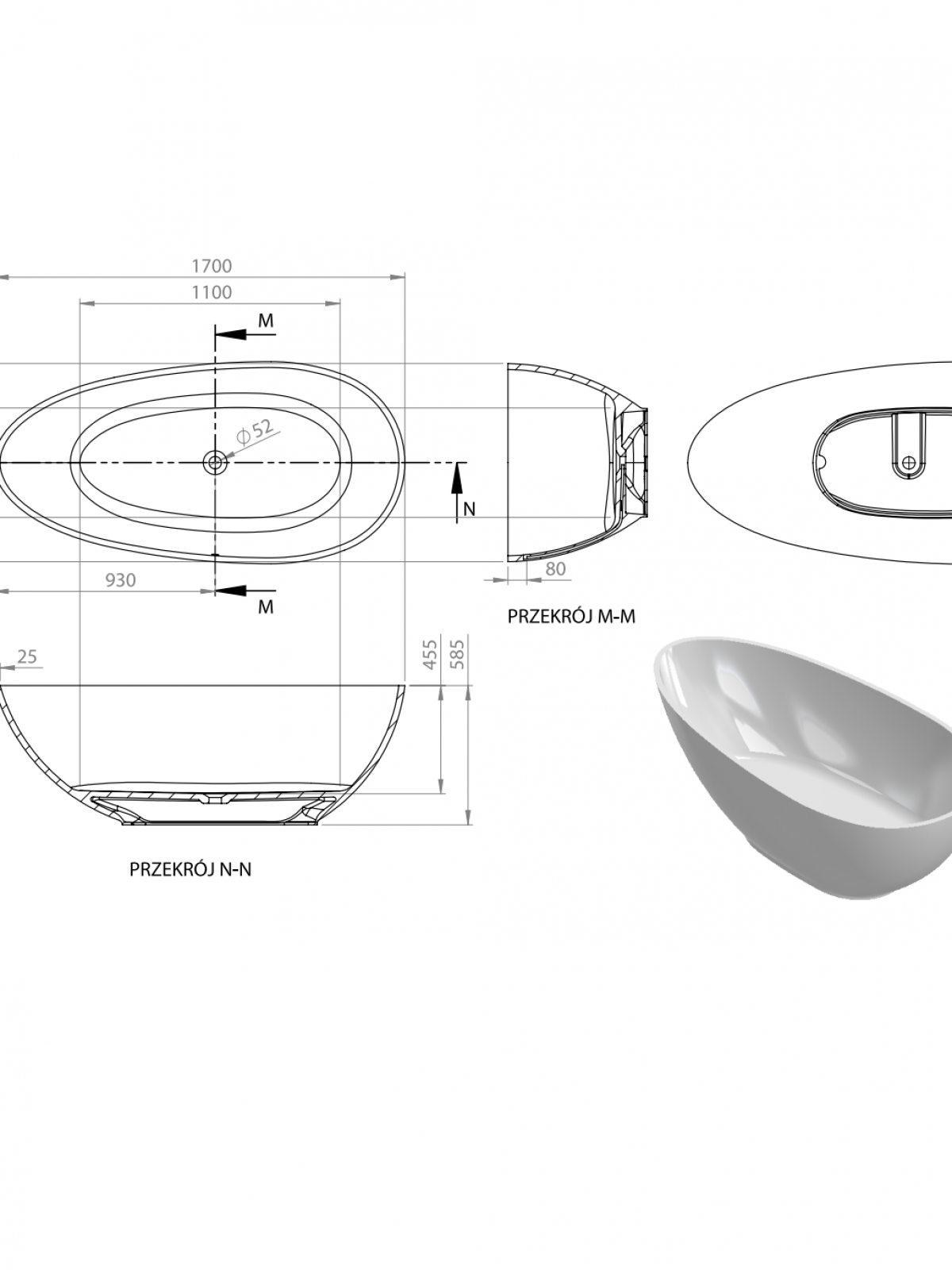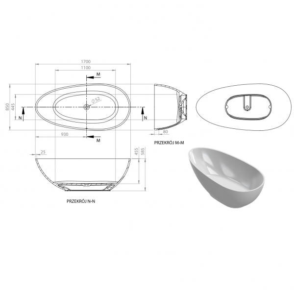 Ванна Carina 1700x850 з інтегрованим переливом, з сифоном click-clack (1 сорт)
