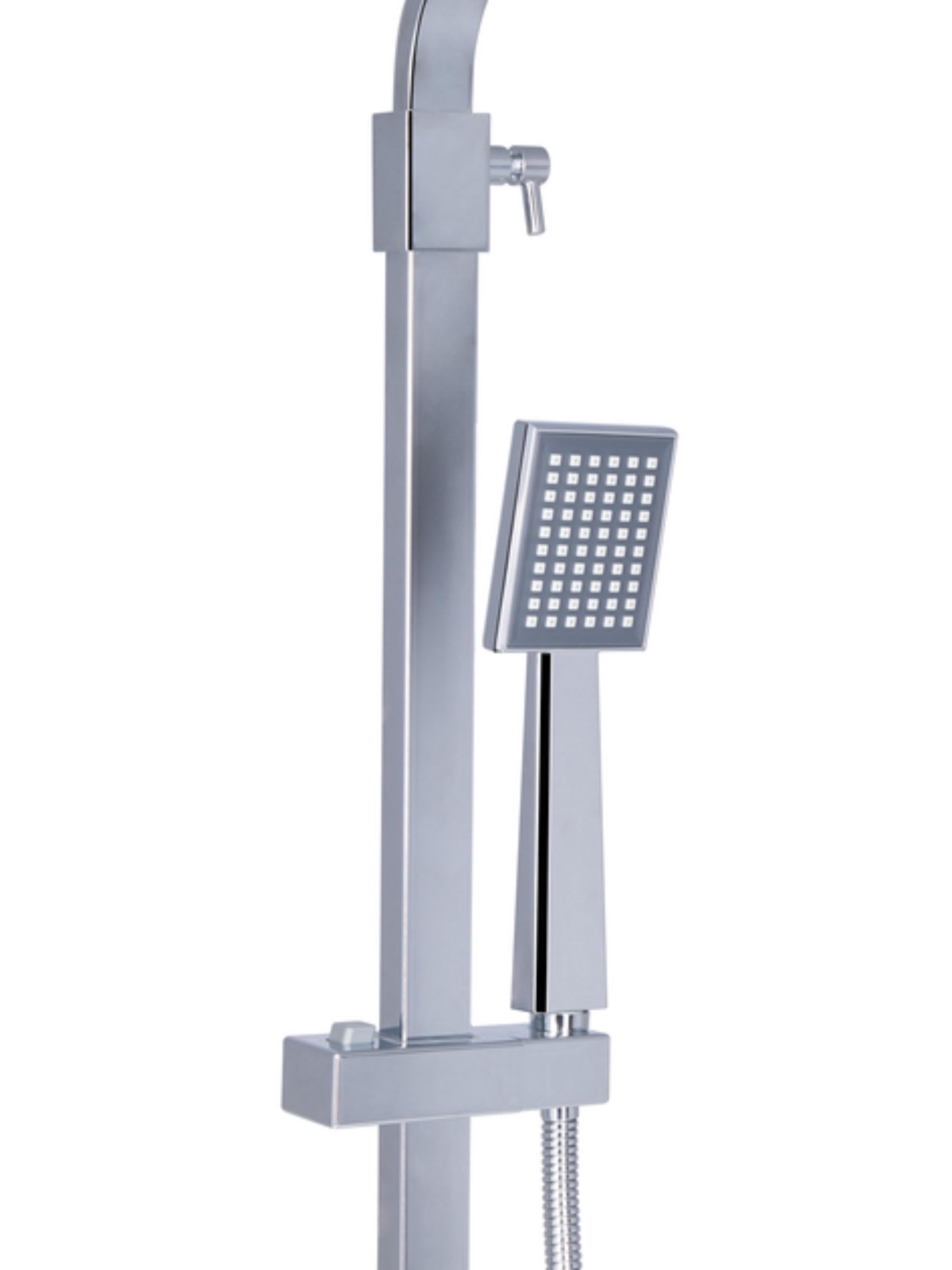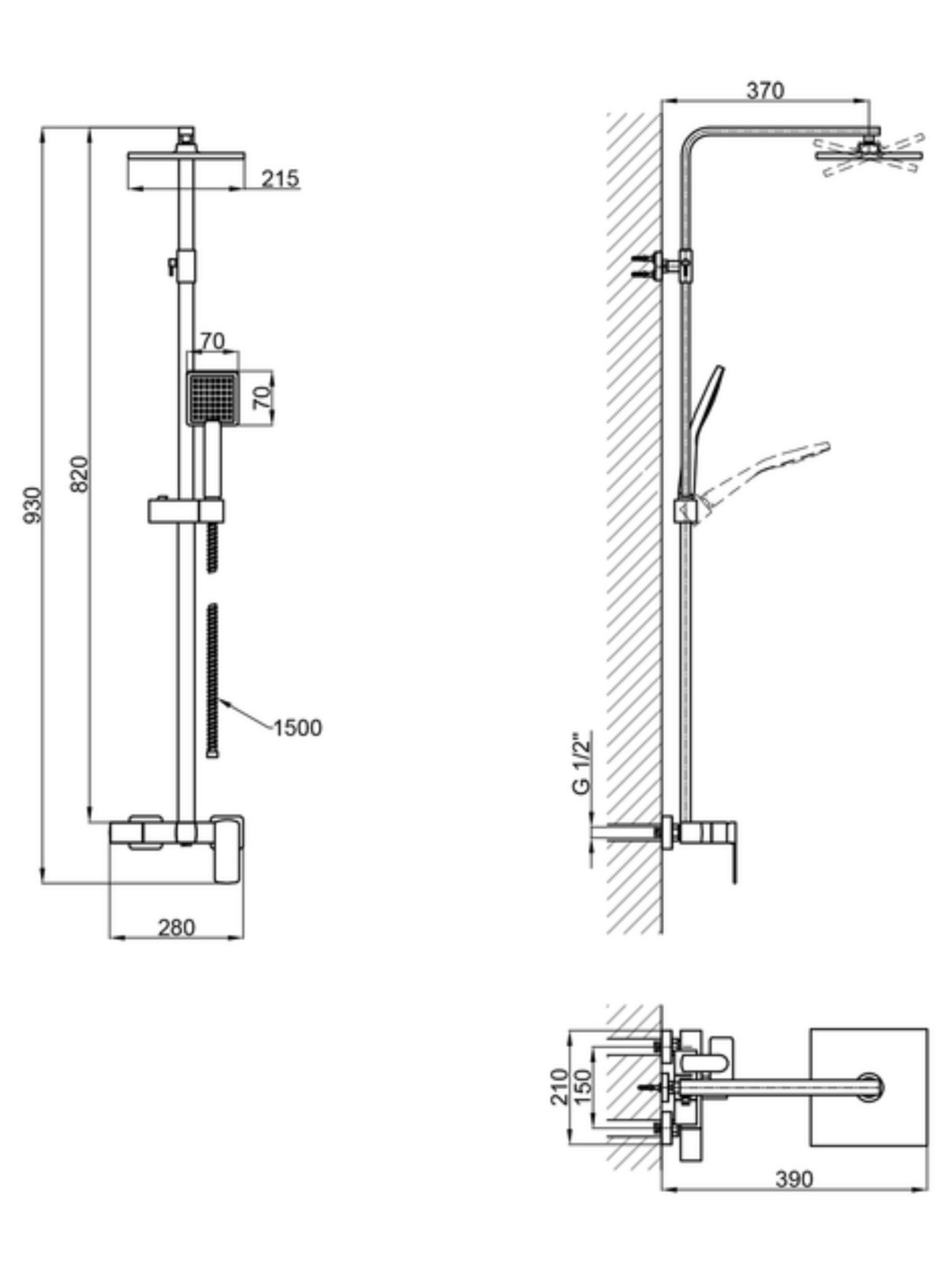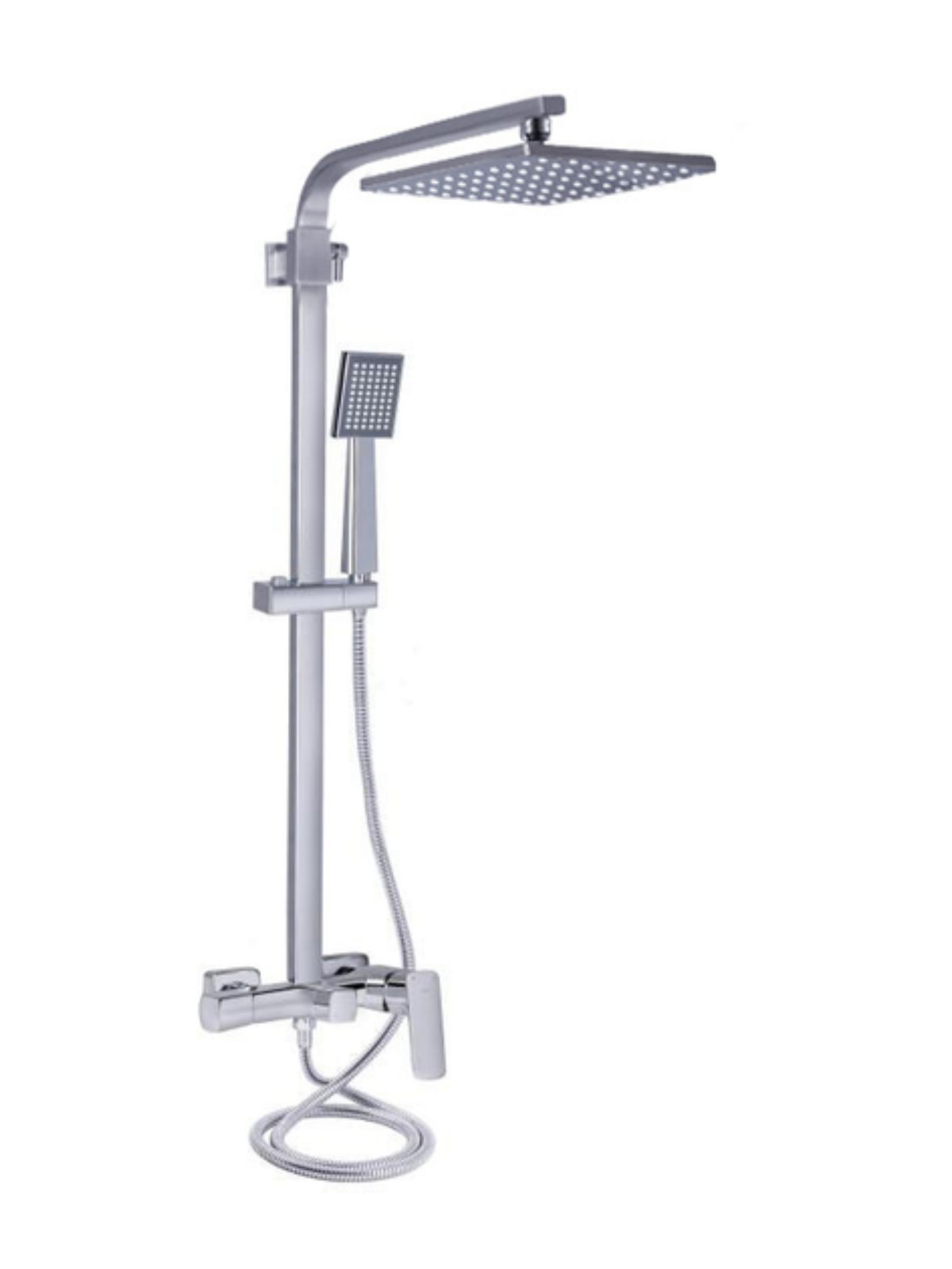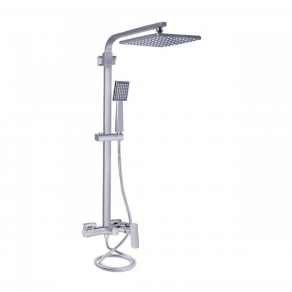 Комплектація: Настінний змішувач із перемикачем, верхній душ квадратної форми, ручна лійка, душовий шланг, штанга з регульованим тримачем для лійки, кріпильні елементи та ущільнювальні кільця.