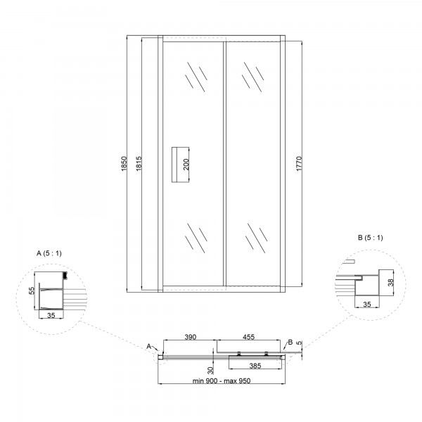 Габаритні розміри виробу (ШхГхВ), мм: 900-950х55х1850