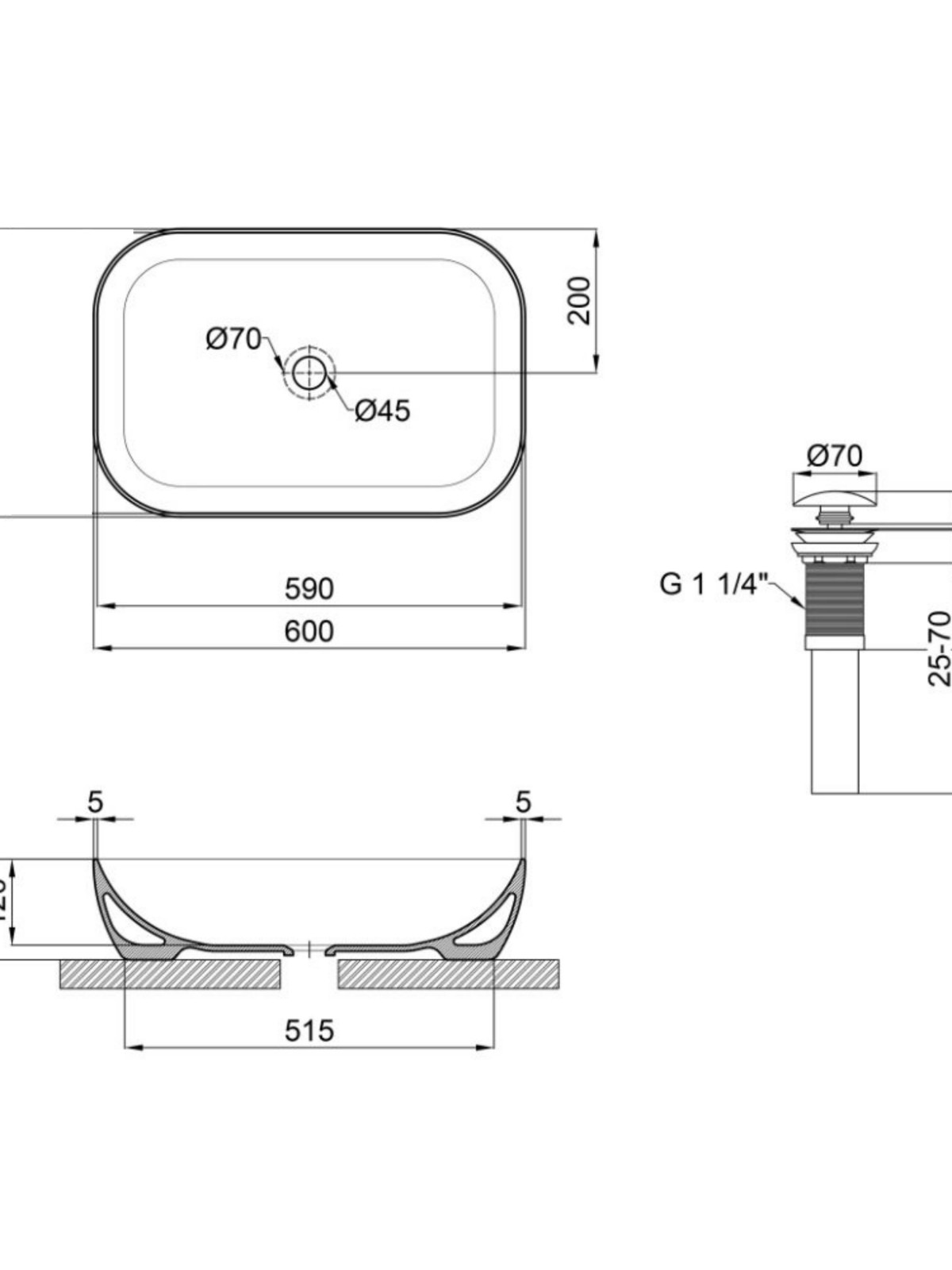 Габаритні розміри виробу (ШхГхВ), мм: 600x390x150 - раковина; 70х70х225 - донный клапан