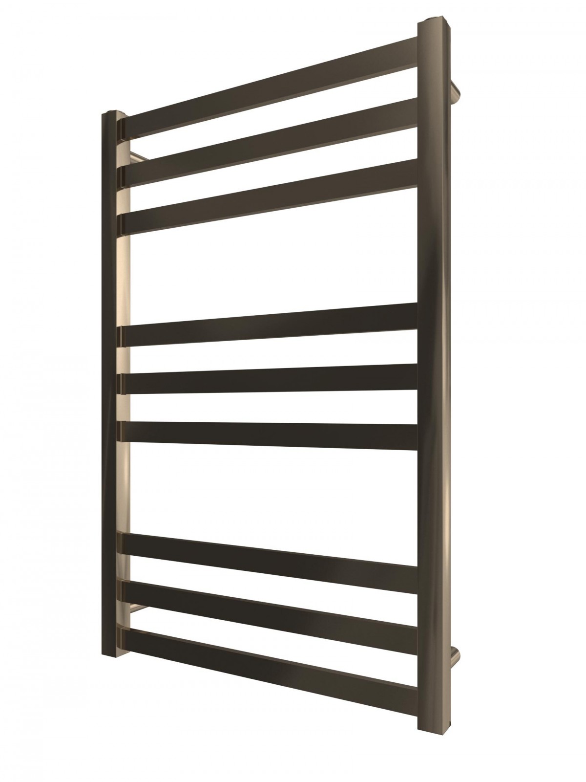 Водяна рушникосушарка INOX Чикаго 770х530/500 бронза. Розміри: висота - 770 мм, ширина - 530 мм, глибина 55 мм, міжцентрова відстань для підключення - 500 мм, діаметр підключення G1/2''. Варіанти підключення: нижнє, діагональне та бічне. Кількість ребер - 9. Виготовлена з полірованої нержавіючої сталі без хромування. Для всесезонної роботи водяну модель можна переобладнати на комбіновану, встановивши ТЕН, рекомендована потужність 300 Вт. Сумісні аксесуари: поворотні полиці та навісні гачки для збільшення функціональності. Рекомендовано підключати рушникосушарку за допомогою кранів Маріо. Гарантія - 50 років в закритій системі опалення, 5 років у централізованій.