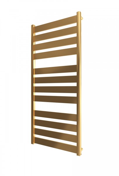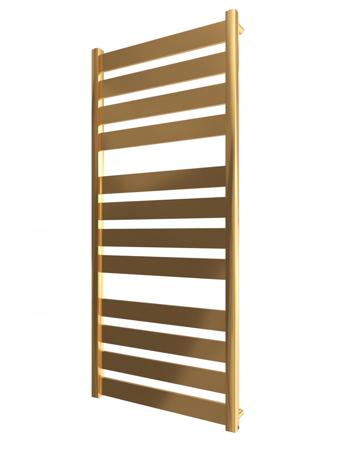 Водяна рушникосушарка INOX Санті 1170х530/500 золото лайт. Розміри: висота - 1 170 мм, ширина - 530 мм, глибина 170 мм, міжцентрова відстань для підключення - 500 мм, діаметр підключення G1/2''. Варіанти підключення: нижнє, діагональне та бічне. Кількість ребер - 12. Виготовлена з полірованої нержавіючої сталі без хромування. Для всесезонної роботи водяну модель можна переобладнати на комбіновану, встановивши ТЕН, рекомендована потужність 600 Вт. Сумісні аксесуари: поворотні полиці та навісні гачки для збільшення функціональності. Рекомендовано підключати рушникосушарку за допомогою кранів Маріо. Гарантія - 50 років в закритій системі опалення, 5 років у централізованій.