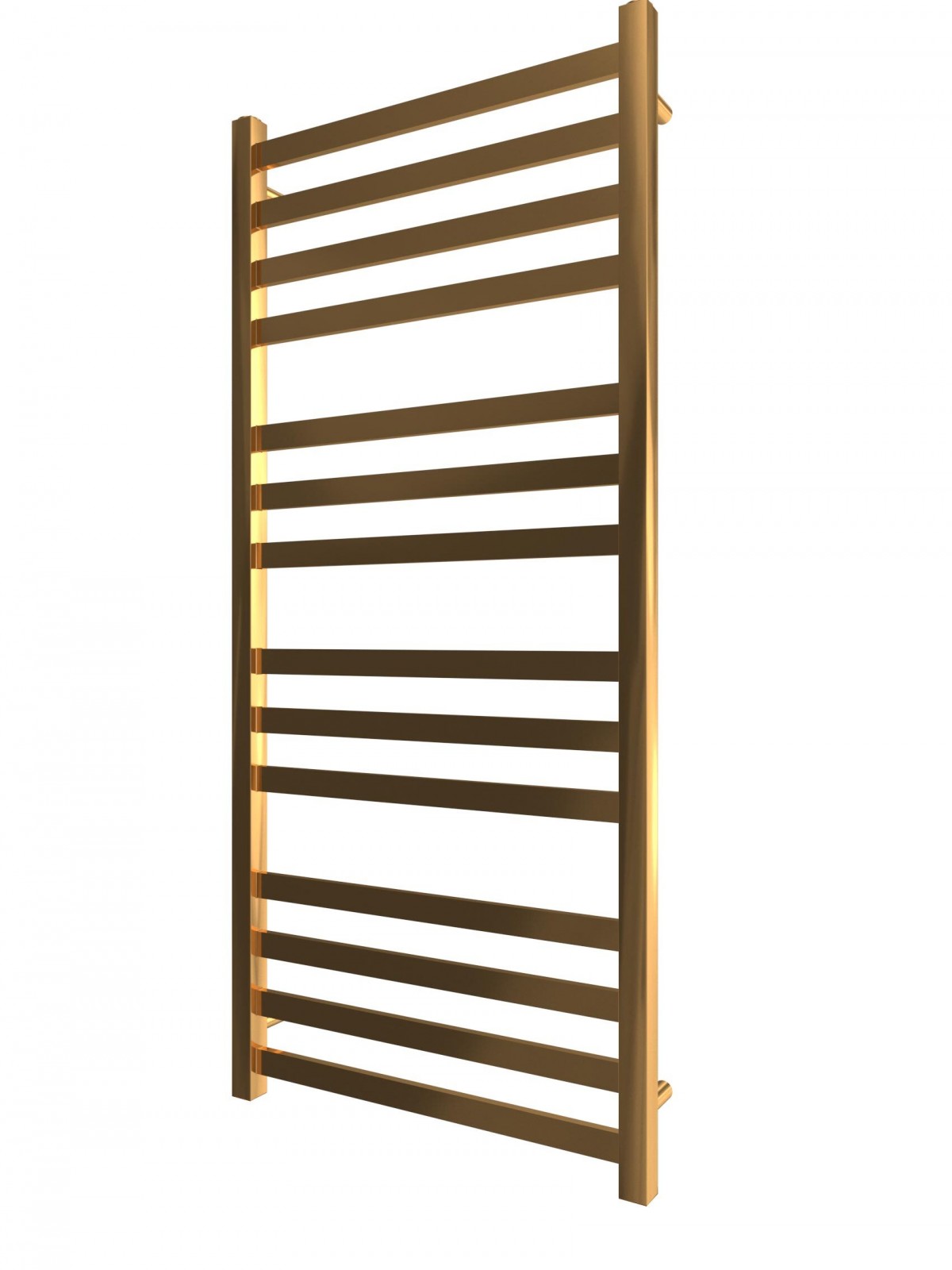 Водяна рушникосушарка INOX Чикаго 1170х530/500 золото лайт. Розміри: висота - 1 170 мм, ширина - 530 мм, глибина 85 мм, міжцентрова відстань для підключення - 500 мм, діаметр підключення G1/2''. Варіанти підключення: нижнє, діагональне та бічне. Кількість ребер - 12. Виготовлена з полірованої нержавіючої сталі без хромування. Для всесезонної роботи водяну модель можна переобладнати на комбіновану, встановивши ТЕН, рекомендована потужність 600 Вт. Сумісні аксесуари: поворотні полиці та навісні гачки для збільшення функціональності. Рекомендовано підключати рушникосушарку за допомогою кранів Маріо. Гарантія - 50 років в закритій системі опалення, 5 років у централізованій.