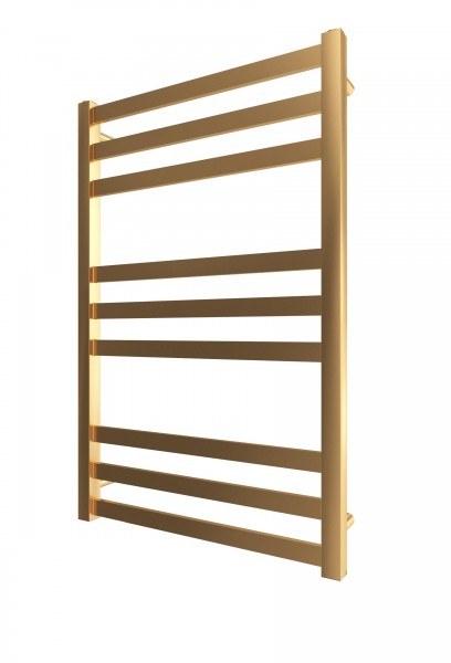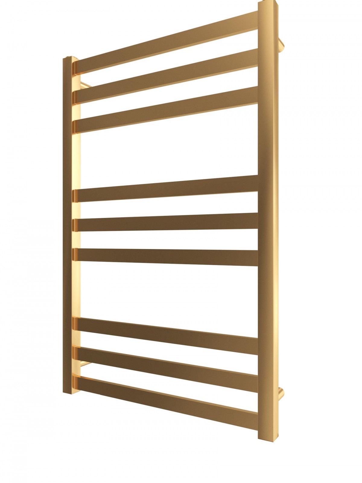 Водяна рушникосушарка INOX Чикаго 770х530/500 золото лайт сатин. Розміри: висота - 770 мм, ширина - 530 мм, глибина 55 мм, міжцентрова відстань для підключення - 500 мм, діаметр підключення G1/2''. Варіанти підключення: нижнє, діагональне та бічне. Кількість ребер - 9. Виготовлена з полірованої нержавіючої сталі без хромування. Для всесезонної роботи водяну модель можна переобладнати на комбіновану, встановивши ТЕН, рекомендована потужність 300 Вт. Сумісні аксесуари: поворотні полиці та навісні гачки для збільшення функціональності. Рекомендовано підключати рушникосушарку за допомогою кранів Маріо. Гарантія - 50 років в закритій системі опалення, 5 років у централізованій.