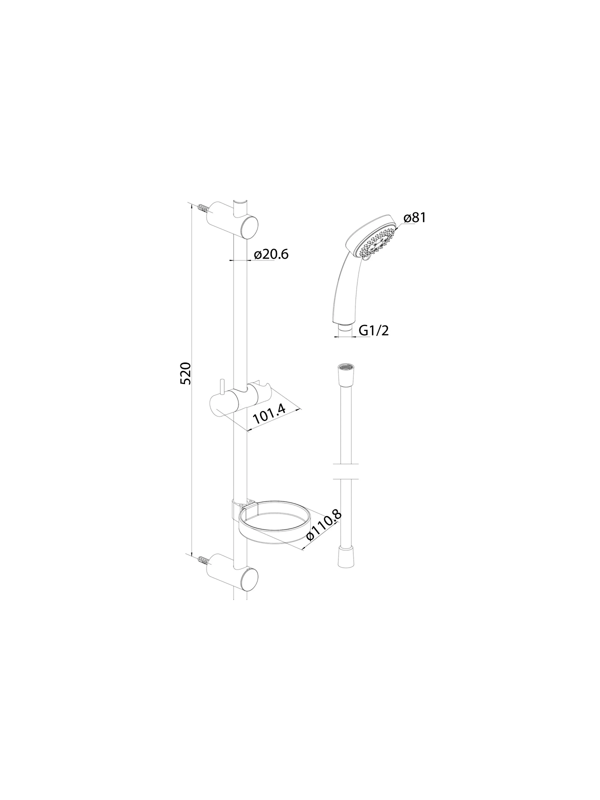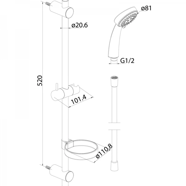 760100310 Contour, душ.комплект: ручн.душ 3 ф-ції d 81 мм, штанга 600 мм, шланг 1750 мм, шт ( (1 сорт)