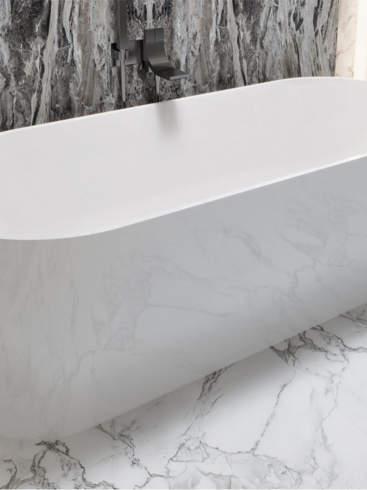 - Збереження тепла. Відмінною властивістю штучного каменю є низька теплопровідність. Завдяки цьому поверхня виробу завжди тепла на дотик і це забезпечує комфортне перебування у ванні.