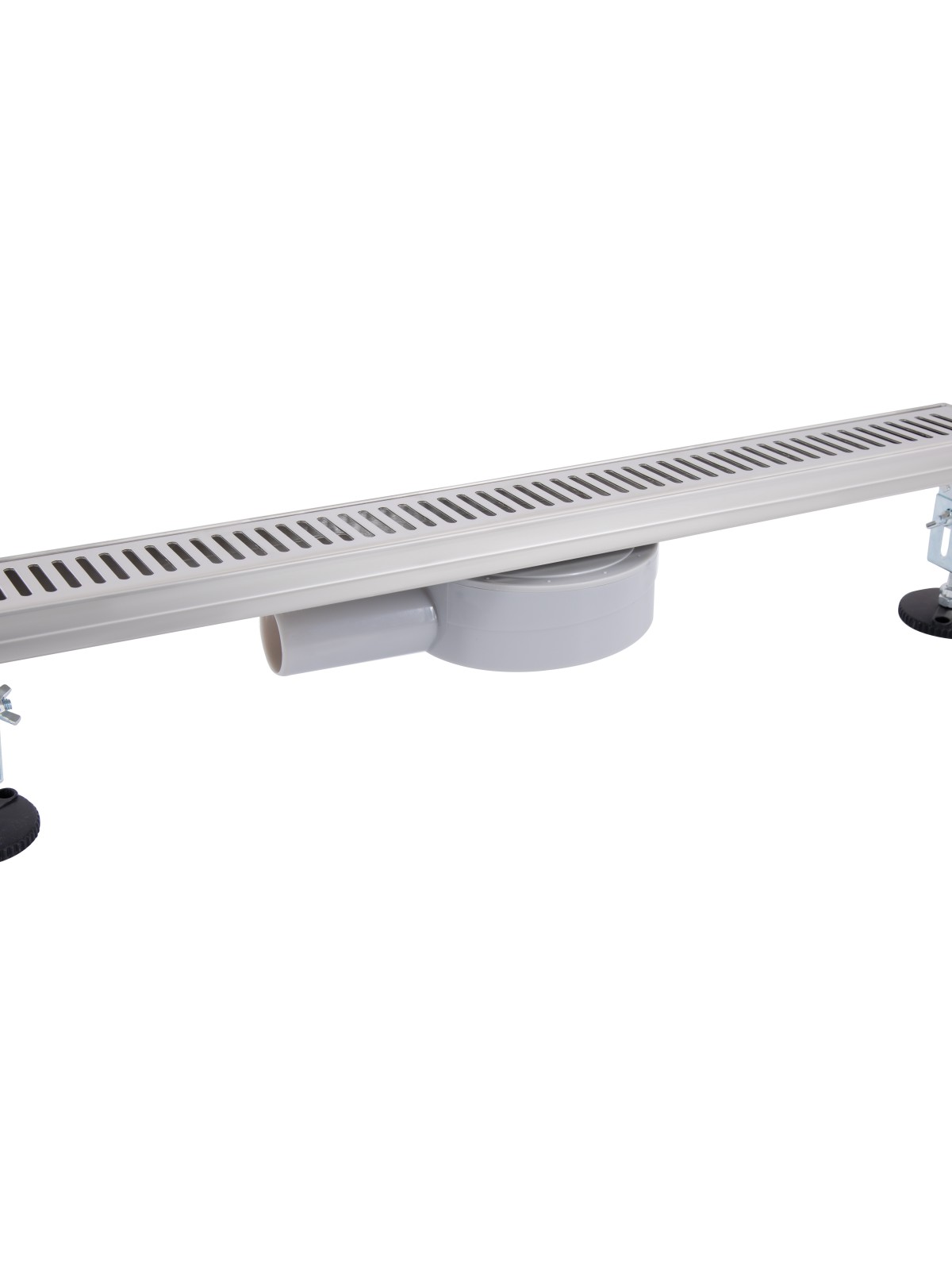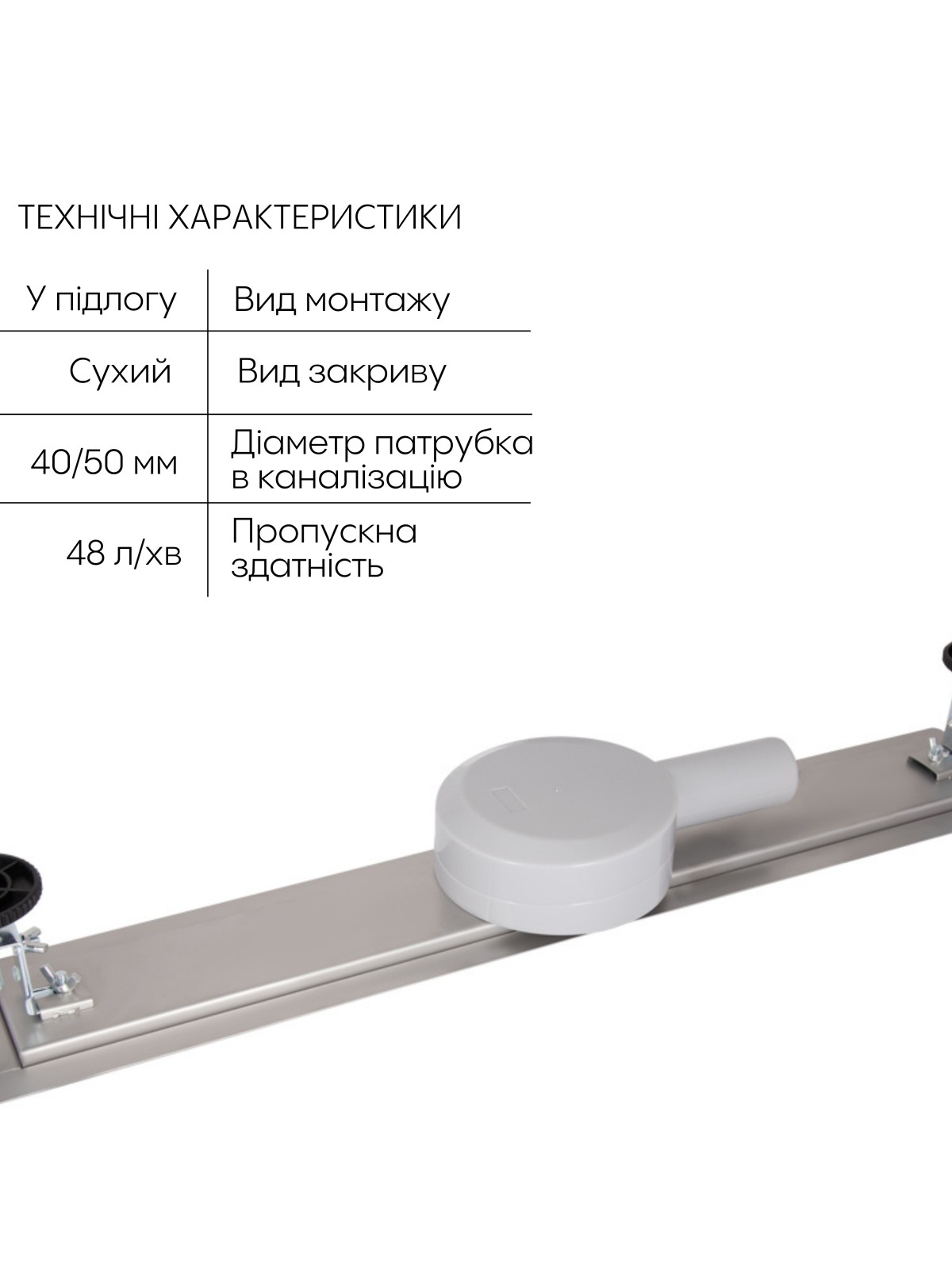 Комплектація: Трап, лоток сухого затвора, ґрати, ніжки (2 шт), перехідник у каналізацію 40/50 мм, гідроізоляція, гачок для ґрат.