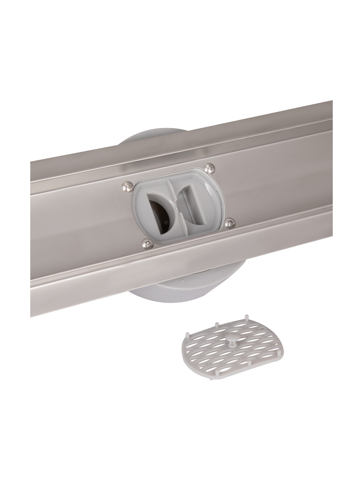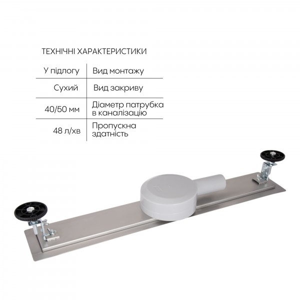 Комплектація: Трап, лоток сухого затвора, ґрати, ніжки (2 шт), перехідник у каналізацію 40/50 мм, гідроізоляція, гачок для ґрат.