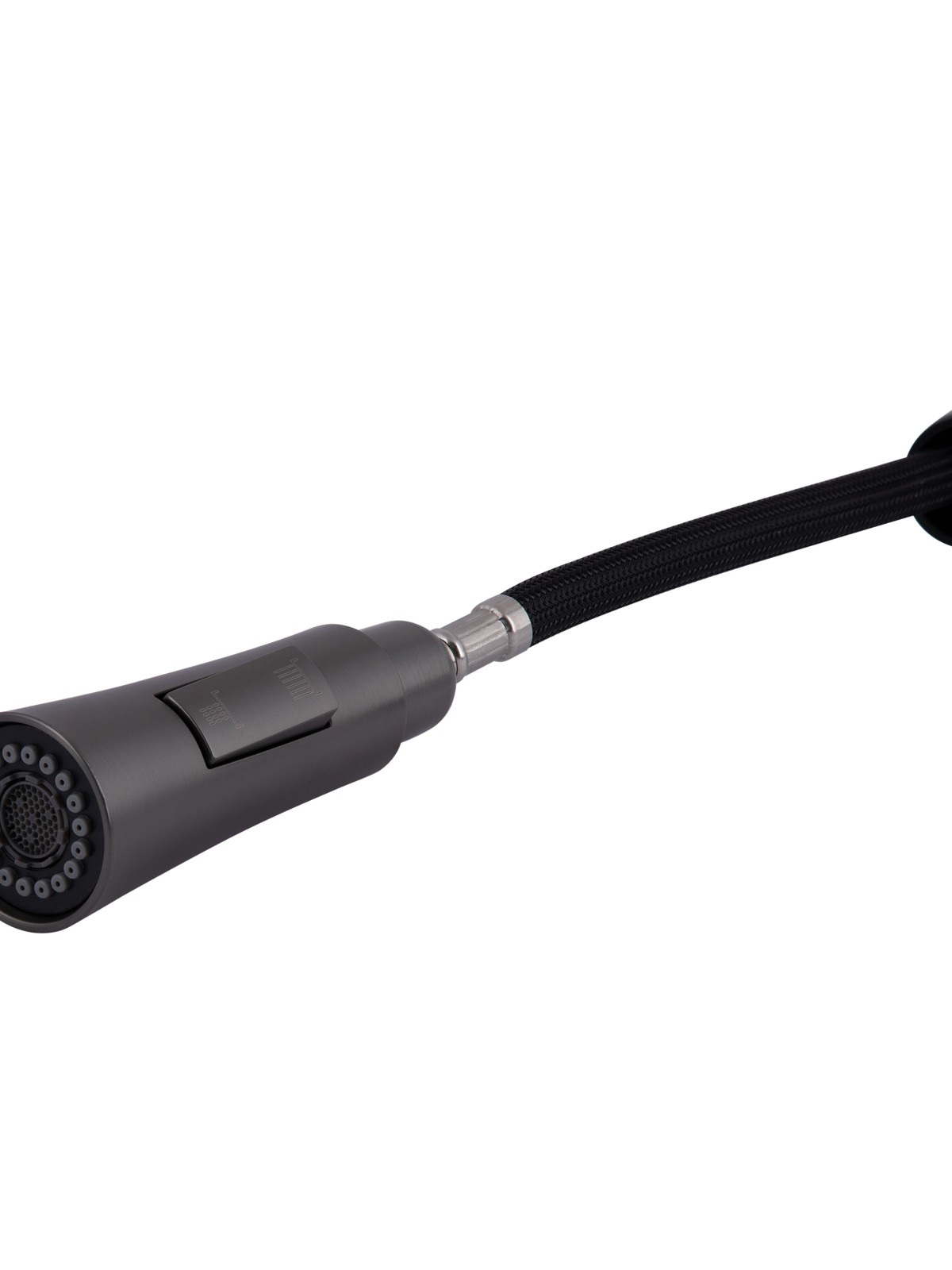 Змішувач для кухні з висувним виливом Qtap Vlasta New QTVLA344GMB45647 виготовлений з високоякісної латуні з PVD покриттям у кольорі збройної сталі, що забезпечує довговічну безперебійну роботу виробу. Завдяки висувній формі виливу можна легко очистити важкодоступні місця на посуді. Управління температурою та напором води здійснюється за допомогою зручного важеля.