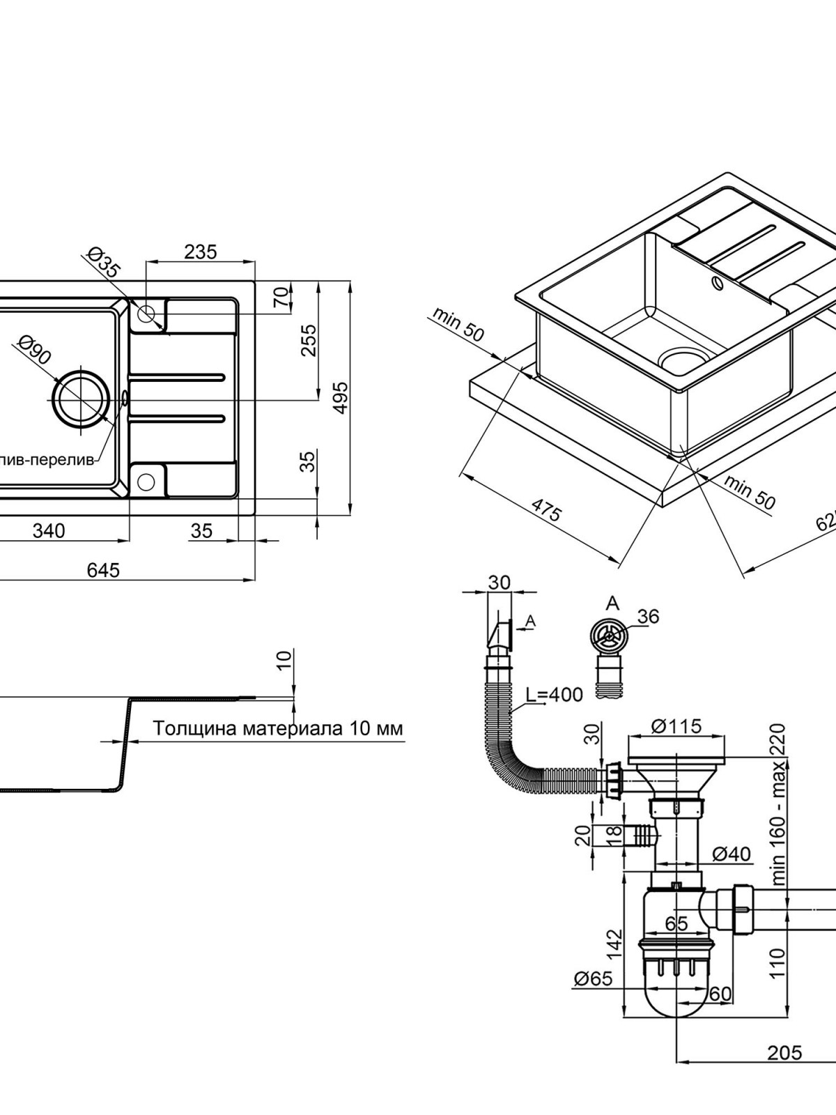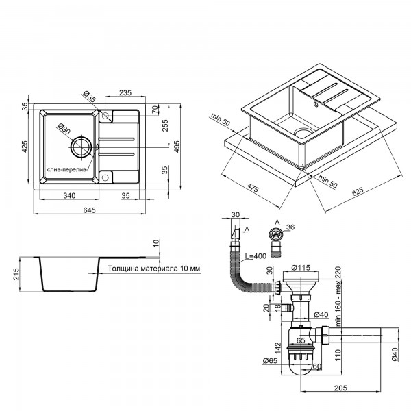 Комплектація: Мийка, сифон, злив/перелив, корзинчастий вентиль, кріплення.