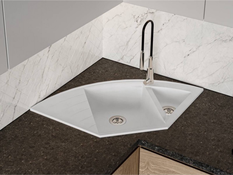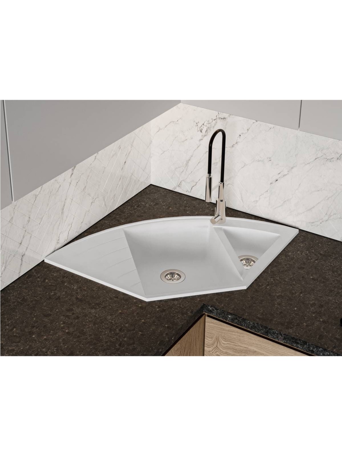 Асиметрична;Кутова кухонна мийка EUROPE має однорідну текстуру та колір - білий. Кількість чаш - 2. Тип установки - врізний. Матеріал мийки - Mirastone - не всочує запахи, відштовхує жир та забруднення, а також не змінює кольору в процесі експлуатації.