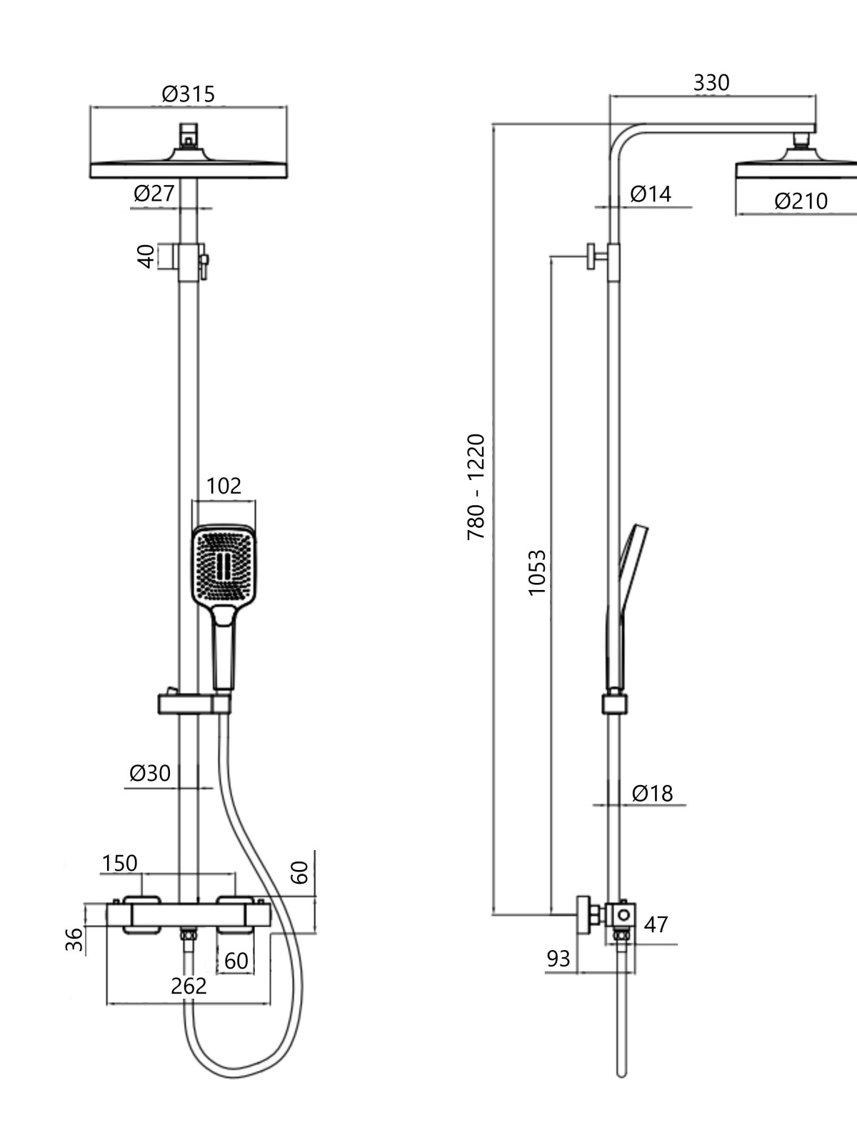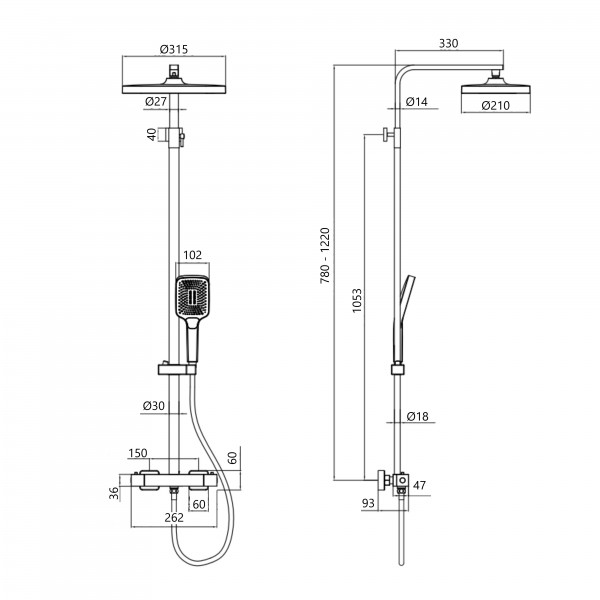 Форма: Ручний душ: квадратна. Верхній душ: квадратна